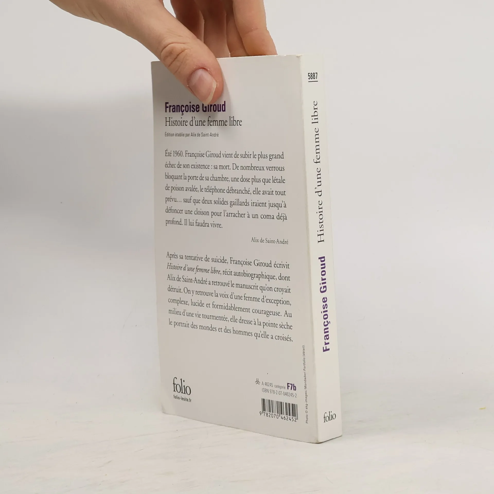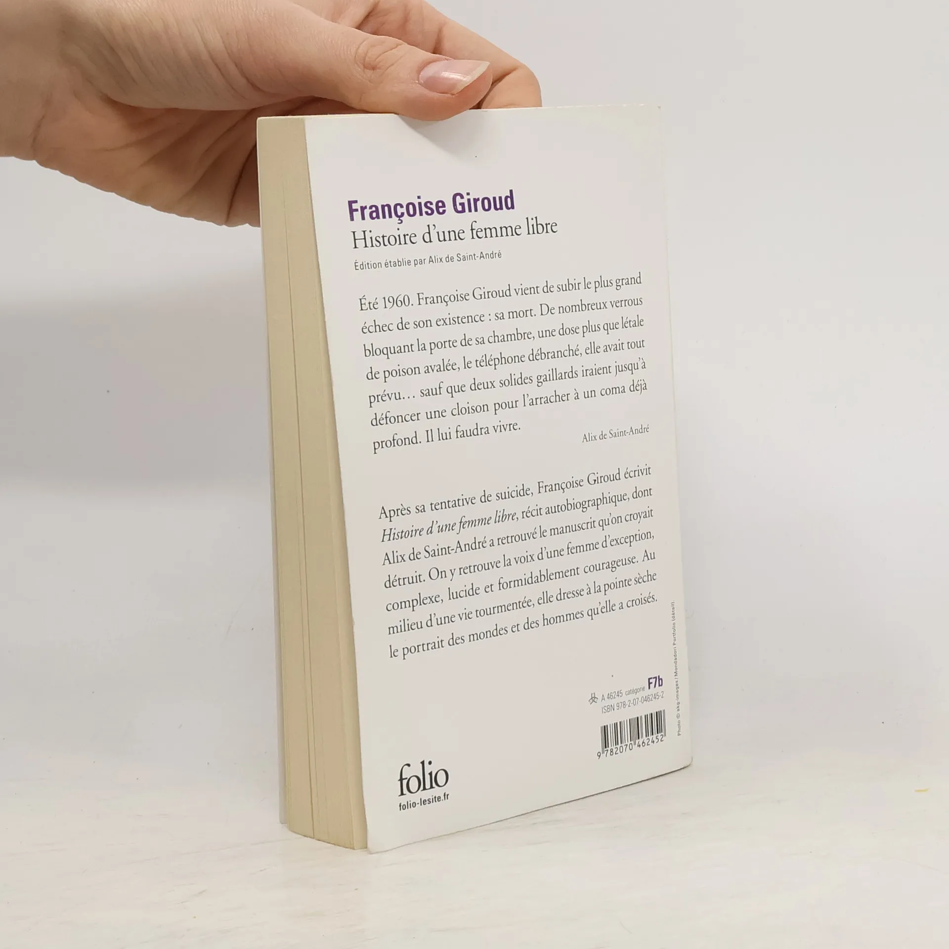 "Eté 1960. Françoise Giroud vient de subir le plus grand échec de son existence : sa mort. De nombreux verrous bloquant la porte de sa chambre, une dose plus que létale de poison avalée, le téléphone débranché, elle avait tout prévu sauf que deux solides gaillards iraient jusqu'à défoncer une cloison pour l'arracher à un coma déjà profond. Il lui faudra vivre. Plaquée par Jean-Jacques Servan-Schreiber, sa passion, et virée de L'Express, ce journal de combat qu'ils avaient fondé ensemble, en brave petit soldat, elle repart pour la guerre avec la seule arme dont elle dispose : sa machine à écrire." Alix de Saint-André. Après sa tentative de suicide, Françoise Giroud écrivit Histoire d'une femme libre, récit autobiographique, dont Alix de Saint-André a retrouvé le manuscrit qu'on croyait détruit. On y retrouve la voix d'une femme d'exception, complexe, lucide, et formidablement courageuse. Au milieu d'une vie tourmentée, elle dresse à la point sèche le portrait des mondes et des hommes qu'elle a croisés.