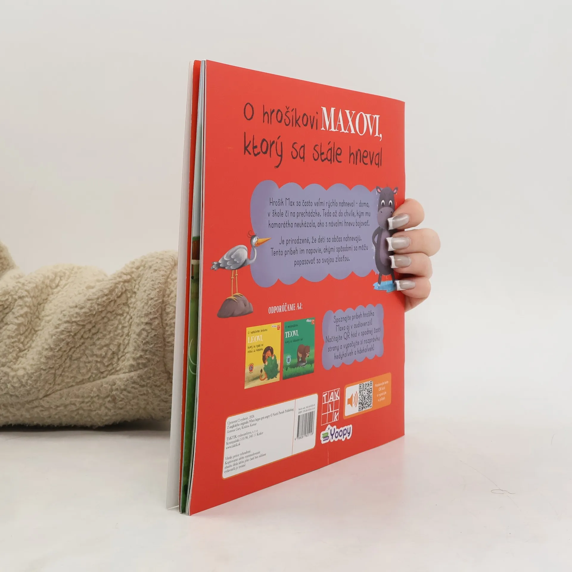 Milý príbeh, ktorý citlivo poukazuje na detský hnev a spôsob, ako ho možno prekonať. Hrošík Max sa často veľmi rýchlo nahneval – doma, v škole či na prechádzke. Frflal pri umývaní zúbkov, trucoval pri raňajkách aj večeri,ukrýval sa pred mamou, keď bol čas ísť späť. Jedného dňa mali v škole športový turnaj a Max skončil druhý v behu aj plávaní A on chcel vyhrať – chcel všetkých poraziť. Keď mu kamarát sloník zo žartu vyprskol vodu z jazierka rovno do tváre, všetci spolužiaci sa rozosmiali. A Max ich za to už nemal rád a vykrikoval od zlosti. Jeho krik začula volavka a dala mu zopár dobrých rád, ako zvládať zlosť. Akých? Príbeh o hrošíkovi Maxovi poukazuje na to, že je prirodzené, ak sa deti občas nahnevajú. Ale zároveň im milou formou napovedá, akými spôsobmi sa môžu popasovať so svojou zlosťou.