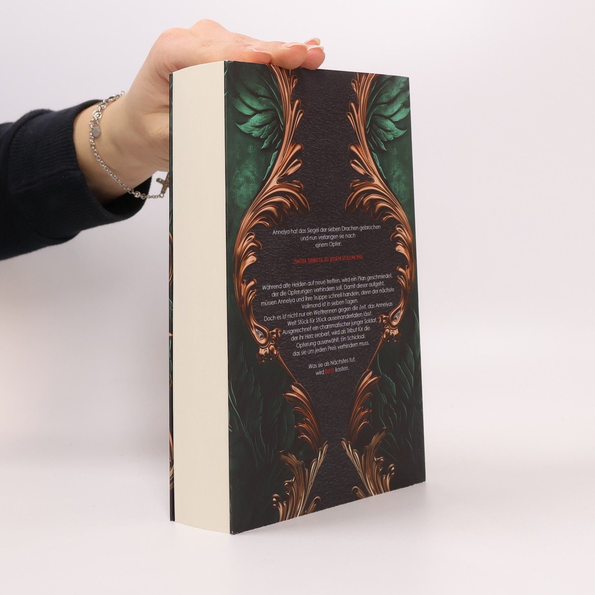 Eine Welt voller Abenteuer, Magie und unerwarteter Liebe. Zwölf Tribute. Sieben Drachen. Ein Schicksal. Annelya hat das Siegel der sieben Drachen gebrochen und nun verlangen sie nach einem Opfer: zwölf Tribute zu jedem Vollmond. Während alte Helden auf neue treffen, wird ein Plan geschmiedet, der die Opferungen verhindern soll. Damit dieser aufgeht, müssen Annelya und ihre Truppe schnell handeln, denn der nächste Vollmond ist in sieben Tagen. Doch es ist nicht nur ein Wettrennen gegen die Zeit, das Annelyas Welt Stück für Stück auseinanderfallen lässt. Ausgerechnet ein charismatischer junger Soldat, der ihr Herz erobert, wird als Tribut für die Opferung auserwählt. Ein Schicksal, das sie um jeden Preis verhindern muss. Was sie als Nächstes tut, wird Blut kosten.