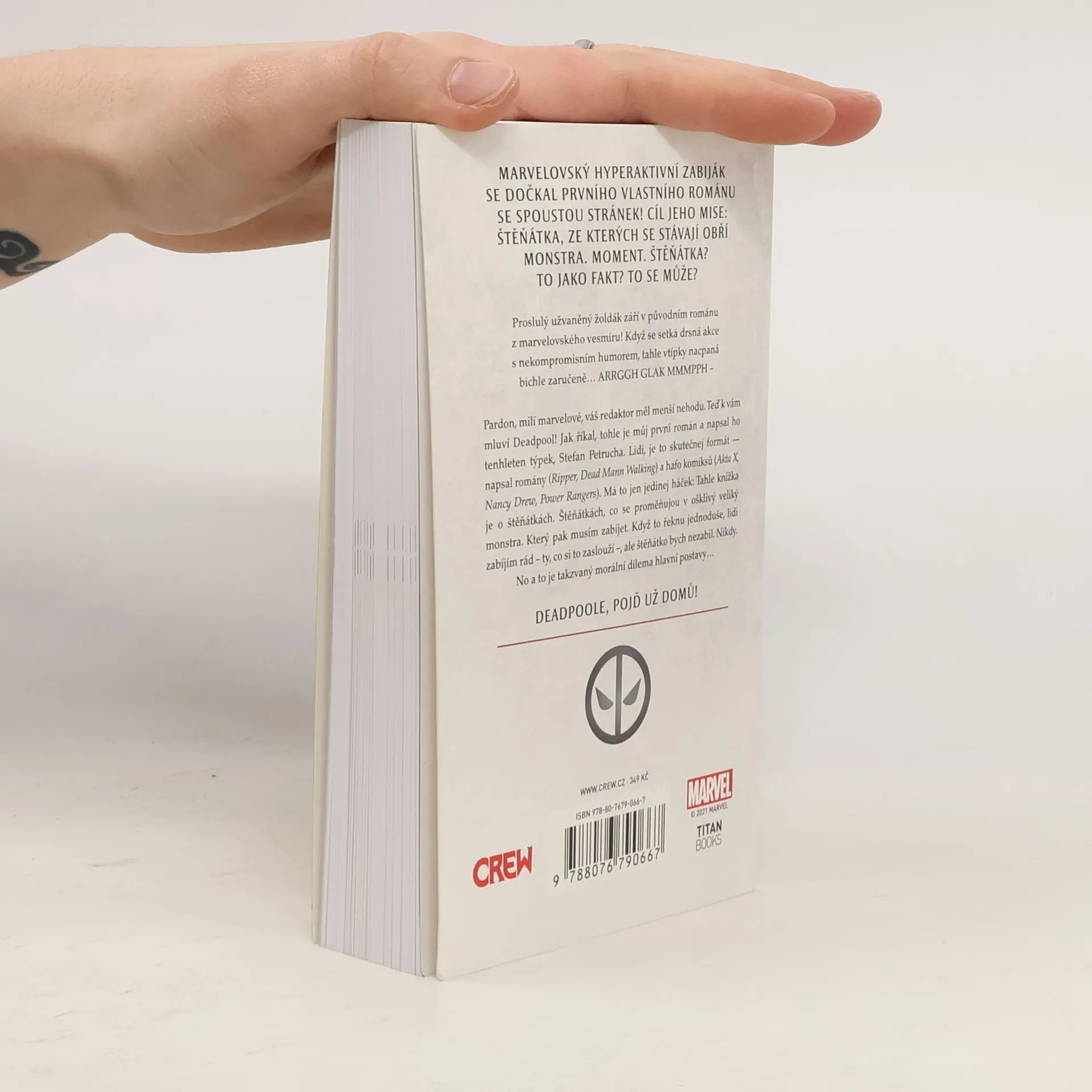 Marvelovský hyperaktivní zabiják se dočkal prvního vlastního románu se spoustou stránek! Cíl jeho mise: štěňátka, ze kterých se stávají obří monstra. Moment. Štěňátka? To jako fakt? To se může? Proslulý užvaněný žoldák září v původním románu z marvelovského vesmíru! Když se setká drsná akce s nekompromisním humorem, tahle vtípky nacpaná bichle zaručeně… ARRGGH GLAK MMMPPH- Pardon, milí marvelové, váš redaktor měl menší nehodu. Teď k vám mluví Deadpool! Jak říkal, tohle je můj první román, a napsal ho tenhleten týpek, Stefan Petrucha. Lidi, je to skutečnej formát — napsal romány (Ripper, Dead Mann Walking) a hafo komiksů (Akta X, Nancy Drew, Power Rangers). Má to jen jedinej háček: Tahle knížka je o štěňátkách. Štěňátkách, co se proměňujou v ošklivý veliký monstra. Který pak musím zabíjet. Když to řeknu jednoduše, lidi zabíjím rád – ty, co si to zaslouží – ale štěňátko bych nezabil. Nikdy. No a to je takzvaný morální dilema hlavní postavy… DEADPOOLE, POJĎ UŽ DOMŮ!