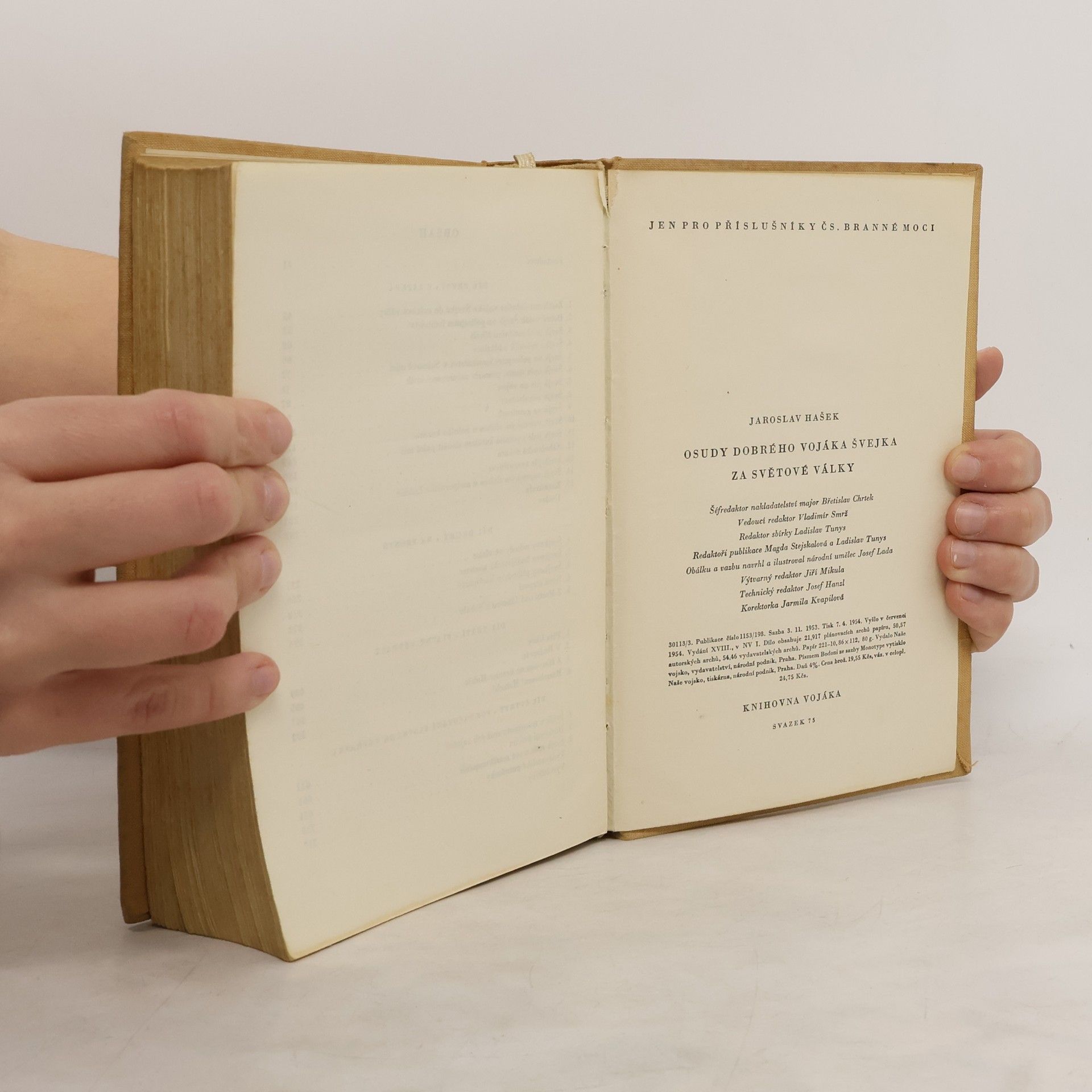 Kuriosní vydání Haškova slavného románu z roku 1954 , jen pro příslušníky čs. branné moci. Čtyři díly: V zázemí, Na frontě, Slavný výprask, Pokračování slavného výprasku. Ilustrace Josef Lada. Rozsáhlé vydavatelské vysvětlivky.