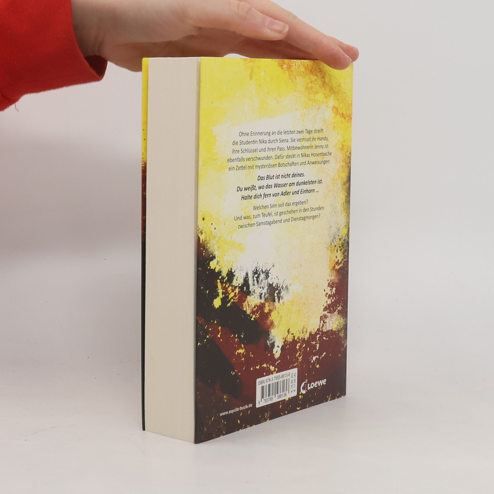 Das Buch ist bei deiner Buchhandlung vor Ort und bei vielen Online-Buchshops erhältlich! +++ Der Spiegel Nr. 1 Bestseller +++ Ohne Erinnerung an die letzten zwei Tage streift die Studentin Nika durch Siena. Sie vermisst ihr Handy, ihre Schlüssel und ihren Pass. Mitbewohnerin Jennifer ist ebenfalls verschwunden. Dafür steckt in Nikas Hosentasche ein Zettel mit mysteriösen Botschaften und Anweisungen. Das Blut ist nicht deines. Du weißt, wo das Wasser am dunkelsten ist. Halte dich fern von Adler und Einhorn ... Welchen Sinn soll das ergeben? Und was, zum Teufel, ist geschehen zwischen Samstagabend und Dienstagmorgen? Bestseller-Autorin Ursula Poznanski schickt ihre Heldin durch die engen Gassen und die unterirdischen Labyrinthe Sienas, die ebenso im Dunkel liegen wie Nikas Erinnerungen an die letzten zwei Tage. Ein unlösbar scheinendes Rätsel, ein monströser Verrat und die geheimnisvollen Symbole des mittelalterlichen Siena bilden das Gerüst dieses exzellenten Psychothrillers. Mehr Infos und Hintergründe zum Buch unter: www. aquila-buch. de
