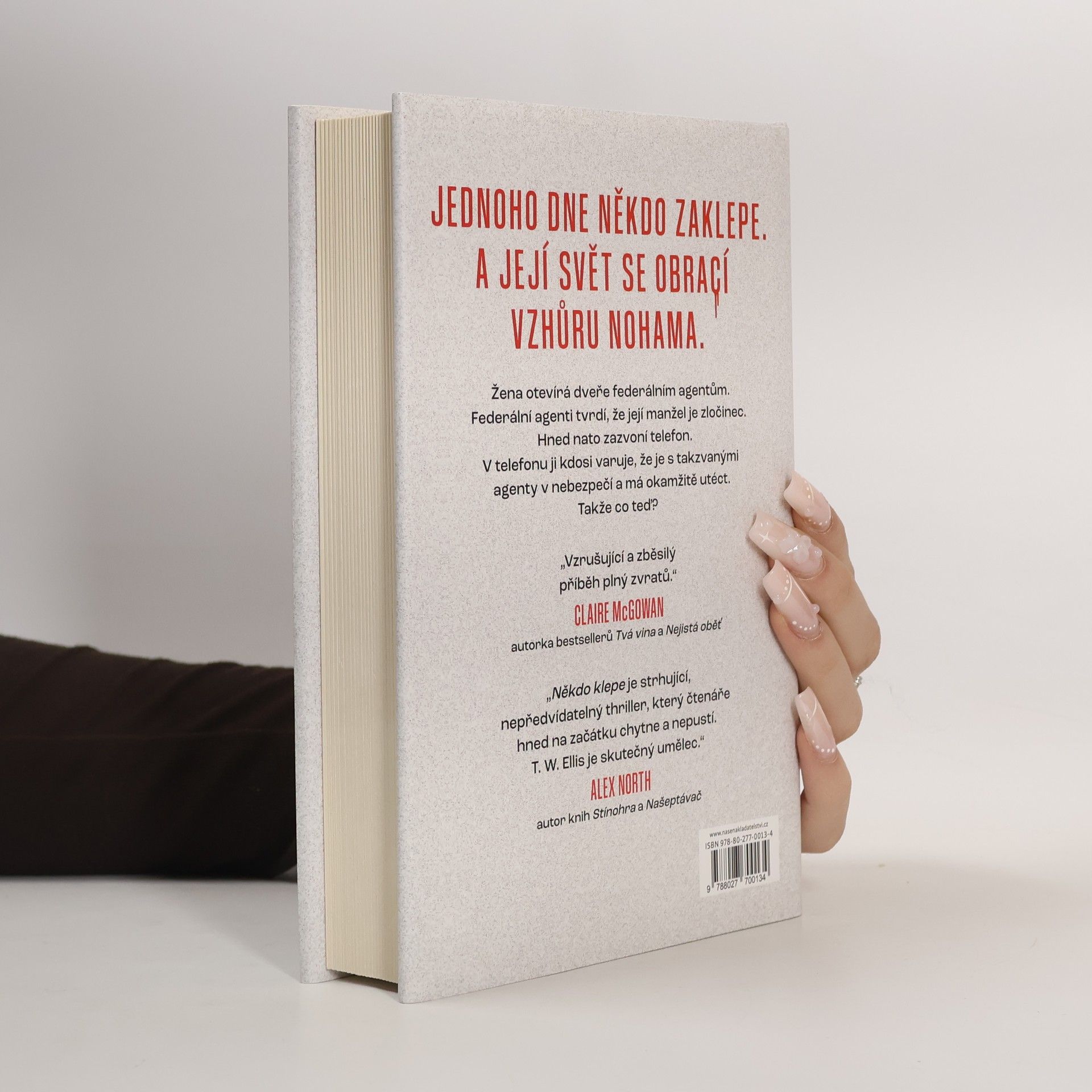 Brzy ráno vám někdo klepe na dveře. Lidé, kteří vypadají a chovají se jako federální agenti. Tvrdí, že váš manžel není tím, za koho se vydává, nýbrž pracuje pro kartel a pere špinavé peníze. Vyzvou vás, abyste jim věřili a odešli s nimi. Pak se však rozezní pevná linka. Kdo v dnešní době ještě používá pevnou linku? Neznámý muž na druhém konci vás nabádá, abyste těm lidem nevěřili. Abyste utekli. Jde vám o život. Komu uvěříte? Komu věřit můžete? V děsivém psychologickém thrilleru autora bestsellerů T. W. Ellise se osamělá žena musí dát na útěk, aby si zachránila život, a přitom musí pochybovat o všem, co kdy milovala.