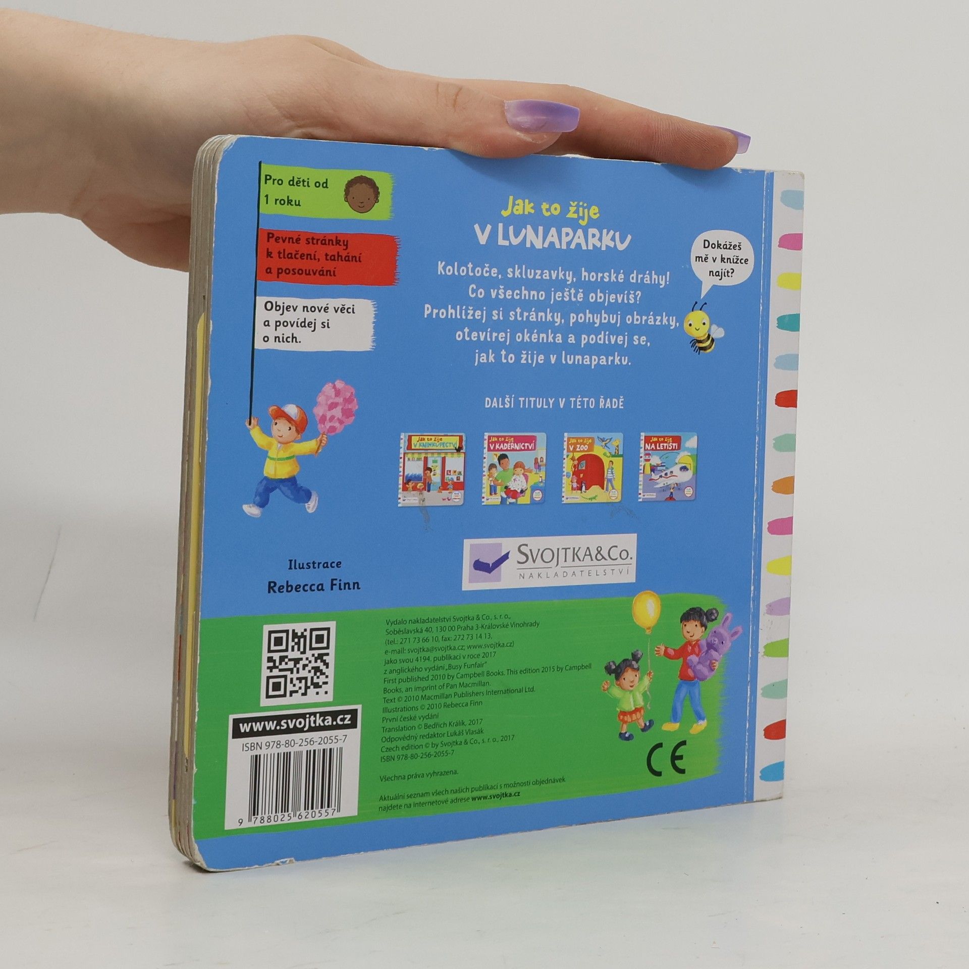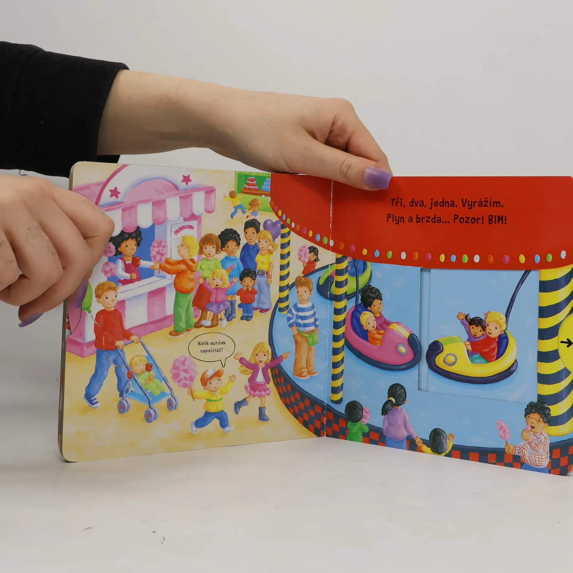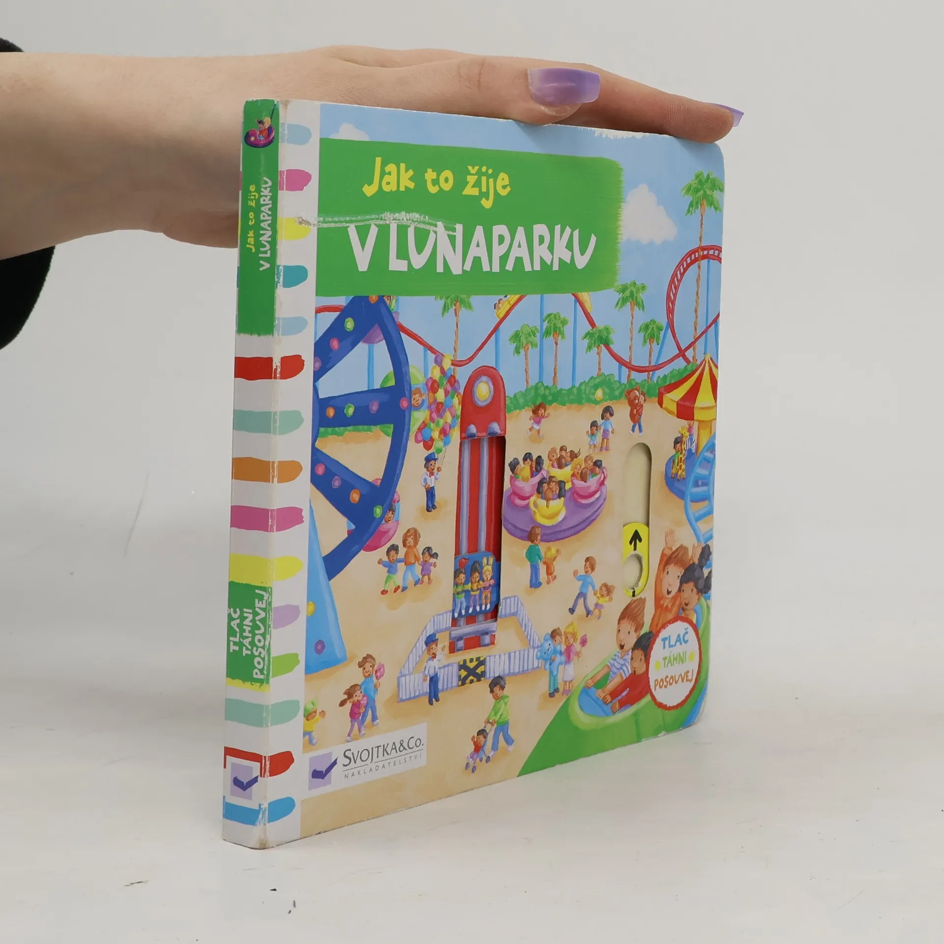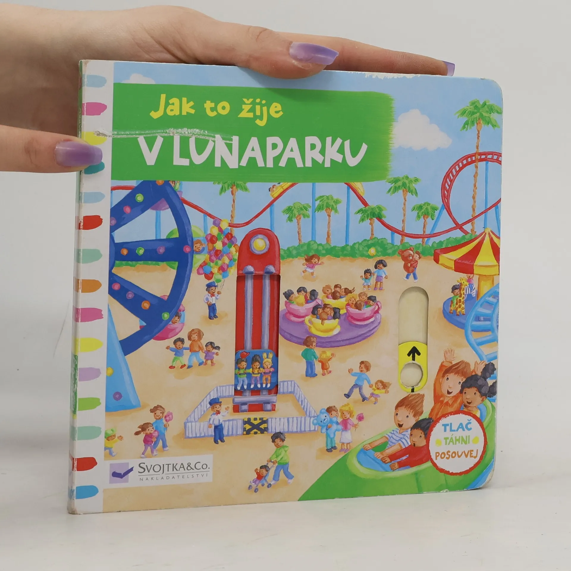 Leporelo je určeno pro děti od jednoho roku. Má pevné stránky s posuvnými a otočnými prvky. Zjisti, jak to žije v lunaparku a procvič si motoriku.