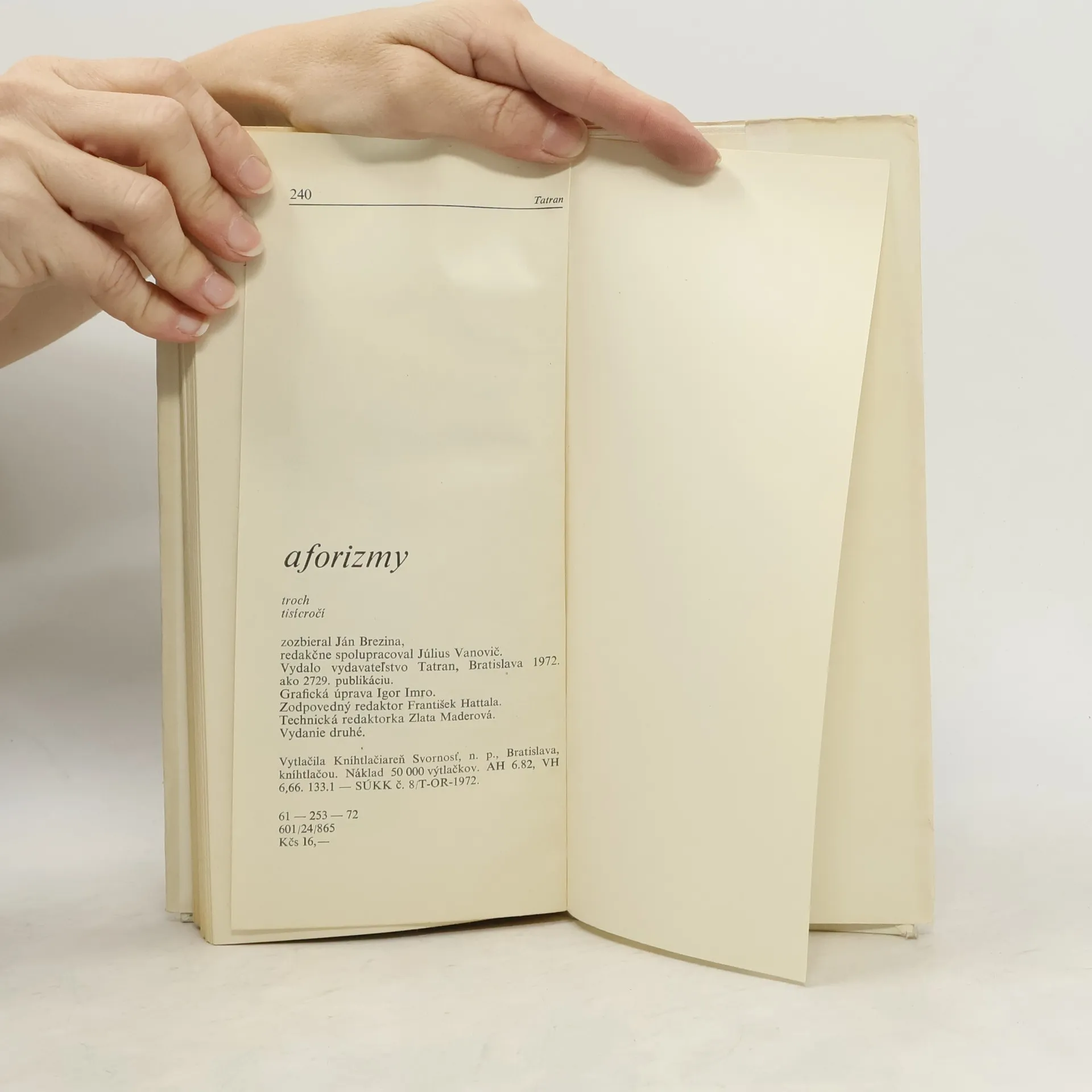 Aforizmy zozbieral Ján Brezina. Aforizmy na témy: Odkiaľ prichádzaš, kam ideš ?-Medzi prameňom a ústím, Človek-môj brat, Za hlasom srdca, Práca a pot, V zdravom tele, Trstina vo vetre, Na riečici času. Silnejšia ako smrť-Za trochu lásky, Žena snov a diaľok, Chlapská reč, Smutno je človeku samému, Pieseň rodiny, Lepší je priateľ blízky, Večne unikajúce. Nepodľahne ani ohňu ani meču-Myšlienka, Slovo, Svetlo rozumu, Míľniky, Čaro krásy, Studňa, ktorá nevysýcha, Človek sa pozná v človeku. Sloboda, rovnosť, bratstvo-Sloboda všetkým sveta národom, Spravodlivosť, Res publicae, Vojna a mier, Heroika. Cena knihy v čase vydania: 16.- Kčs.