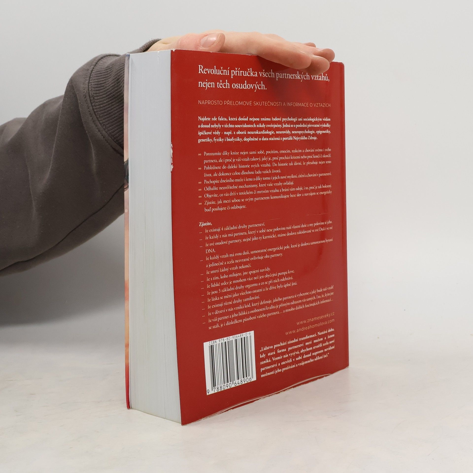 Kniha o vztazích, která změní váš život. Revoluční příručka všech partnerských vztahů, včetně těch osudových. Najdete zde naprosto přelomové skutečnosti a informace týkající se vztahů, fakta, která dosud nejsou známa řadové psychologii, ani sociologickým vědám, a dosud nebyla v těchto souvislostech nikdy zveřejněna. Jedná se nejen o poslední převratné výsledky špičkové světové vědy - např. z oborů neurokardiologie, neurovědy, neuropsychologie, epigenetiky, genetiky, fyziky a biofyziky, související se vztahy, ale i skutečnosti a souvislosti z duchovních věd. Kniha je výjimečná syntézou obou pramenů poznání a také tím, že vám zodpoví všechny otázky na téma partnerství, na které jste dosud hledali odpovědi, ale nenalezli je. Dozvíte se například, že DNA je neuroplastická, neboli že začínáme být schopni ji sami přepisovat svým vlastním vědomím. Že v DNA je uložen kód našich partnerů. Že žádný vztah nikdy neskončí, ani smrtí jednoho z partnerů. Že pouhou myšlenkou, i na vzdálenost tisíců kilometrů, ovlivňujeme tepovou frekvenci toho, na nějž s láskou pomyslíme a mnoho podobných převratných informací, které nebyly dosud zveřejněny v těchto souvislostech. Lze koupit na www.znameseveky.cz