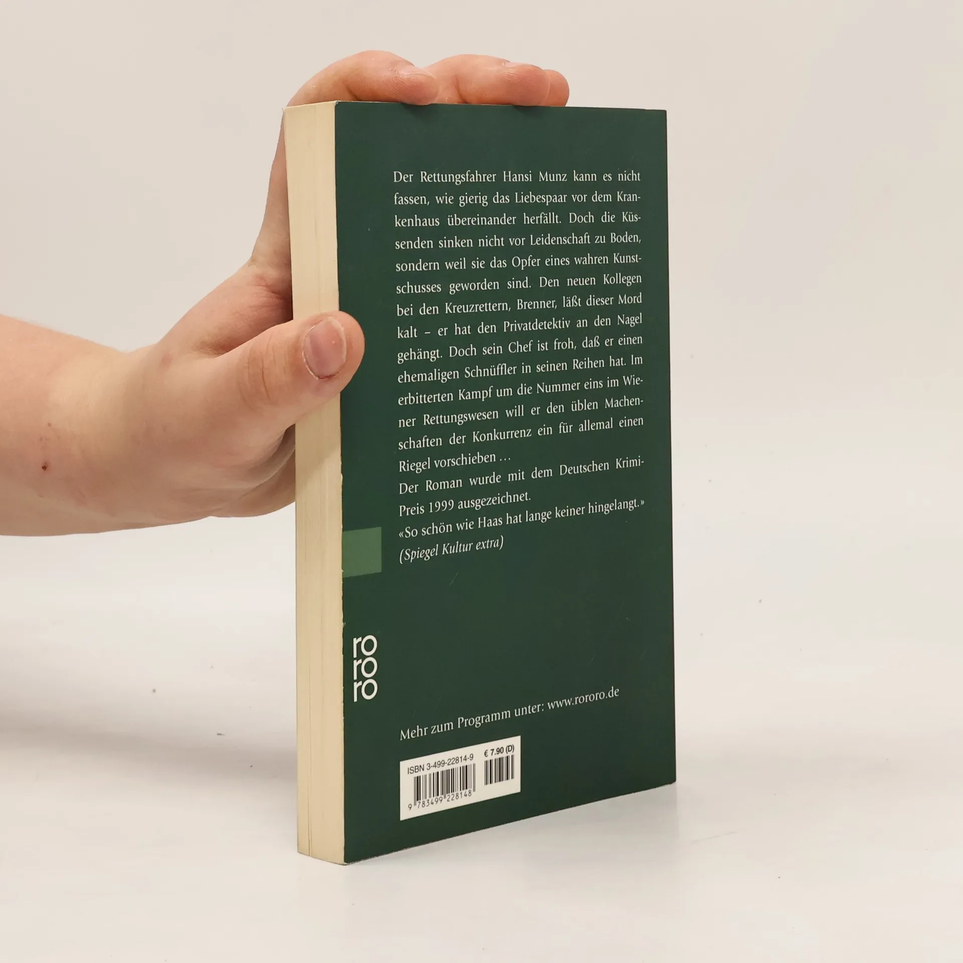 Der Rettungsfahrer Hansi Munz kann es nicht fassen, wie gierig das Liebespaar vor dem Krankenhaus übereinander herfällt. Doch die Küssenden sinken nicht vor Leidenschaft zu Boden, sondern weil sie Opfer eines wahren Kunstschusses geworden sind. Den neuen Kollegen bei den Kreuzrettern, Brenner, läßt dieser Mord kalt - er hat den Privatdetektiv an den Nagel gehängt. Doch sein Chef ist froh, dass er einen ehemaligen Schnüffler in seinen Reihen hat. Im erbitterten Kampf um die Nummer eins im Wiener Rettungswesen will er den üblen Machenschaften der Konkurrenz ein für allemal einen Riegel vorschieben... Der Roman wurde mit dem Deutschen Krimipreis 1999 ausgezeichnet.
