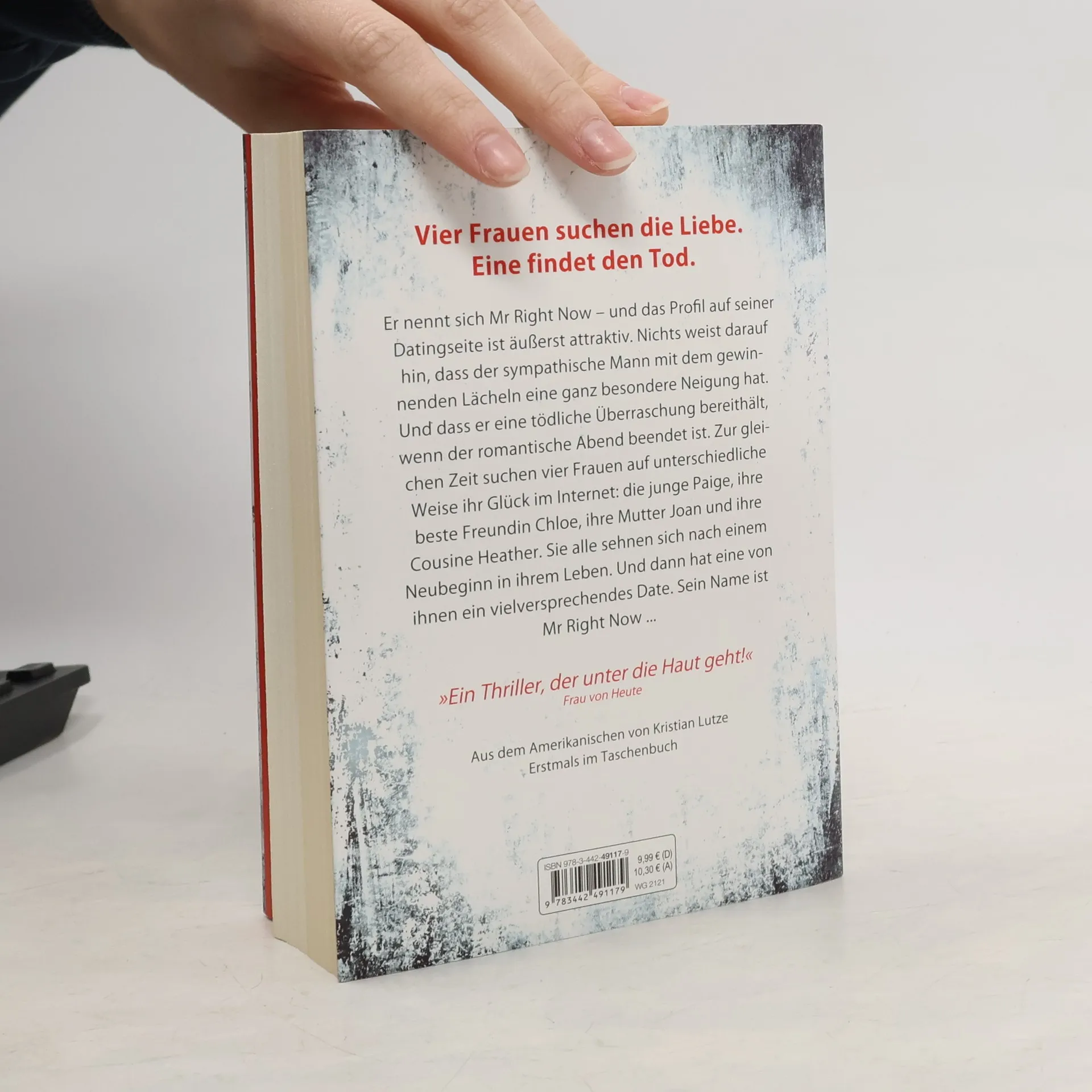 Vier Frauen suchen die Liebe. Eine findet den Tod. Er nennt sich Mr Right Now – und das Profil auf seiner Datingseite ist äußerst attraktiv. Nichts weist darauf hin, dass der sympathische Mann mit dem gewinnenden Lächeln eine ganz besondere Neigung hat. Und dass er eine tödliche Überraschung bereithält, wenn der romantische Abend beendet ist. Zur gleichen Zeit suchen vier Frauen auf unterschiedliche Weise ihr Glück im Internet: die junge Paige, ihre beste Freundin Chloe, ihre Mutter Joan und ihre Cousine Heather. Sie alle sehnen sich nach einem Neubeginn in ihrem Leben. Und dann hat eine von ihnen ein vielversprechendes Date. Sein Name ist Mr Right Now …