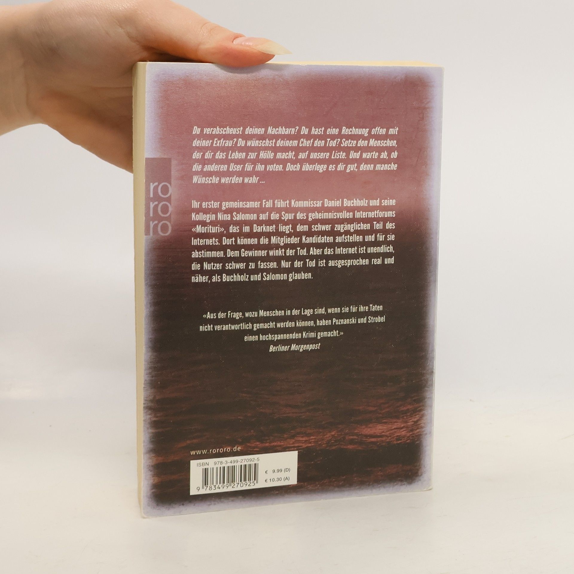 Du verabscheust deinen Nachbarn? Du hast eine offene Rechnung mit deiner Ex-Frau? Du wünschst deinem Chef den Tod? Dann setze ihn auf unsere Liste und warte, ob die anderen User für ihn voten. Aber überlege es dir gut, denn manchmal werden Wünsche wahr... Es ist der erste gemeinsame Fall von Kommissar Daniel Buchholz und seiner Kollegin Nina Salomon, und er führt sie auf die Spur des geheimnisvollen Internetforums «Morituri». Dort können die Mitglieder Kandidaten aufstellen und dann für sie abstimmen. Dem Gewinner winkt der Tod. Aber das Internet ist unendlich, die Nutzer schwer zu fassen. Nur der Tod ist ausgesprochen real, und er ist näher, als Buchholz und Salomon glauben ...