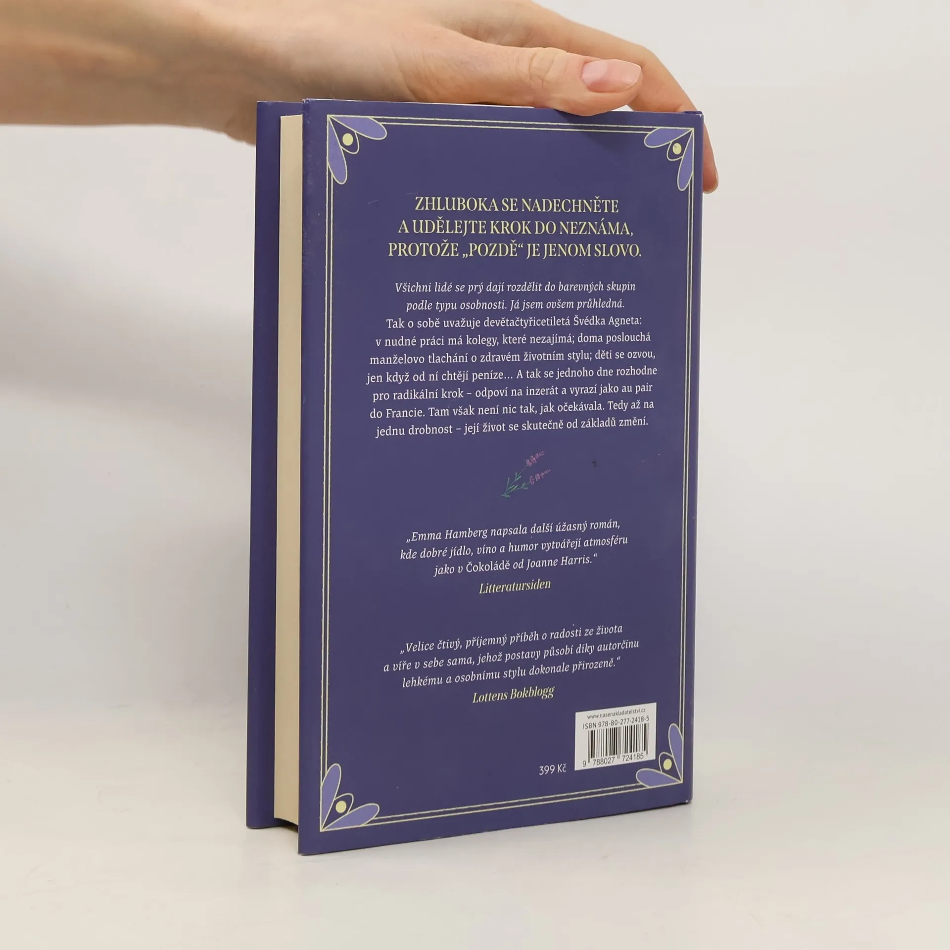 Agnetě je devětačtyřicet let. Děti se ozvou, jen když chtějí peníze, kolegové nemají absolutně zájem o to, co Agneta dělá, co si myslí nebo chce. Její manžel Magnus, pozorovatel ptactva a sportovec, věří, že tělo je chrámem a nemělo by se znečišťovat například červeným vínem nebo meruňkovou marmeládou. Naštěstí je za mrazákem ve sklepě prostor, kde si Agneta může dopřát marmeládu. A pak ležet v posteli, tajně popíjet víno a sledovat televizní pořady o Francii. Když Agneta uvidí v novinách inzerát nabízející místo au pair pro jednoho chlapce ve Francii, rozhodne se k zásadní změně. K překvapení všech ostatních i sebe samé se brzy ocitne na opuštěném náměstí v malé vesnici v Provence, kde nic není tak, jak bylo inzerováno. Dobrodružství může skutečně začít. Jmenuji se Agneta je román o odvaze překročit svůj stín, o francouzských sýrech, klášteře plném palem, o jedné smutné želvě a o tom, jak důležité je nepřestávat tančit. Román, ze kterého na každé stránce prýští radost ze života a láska k lidem.