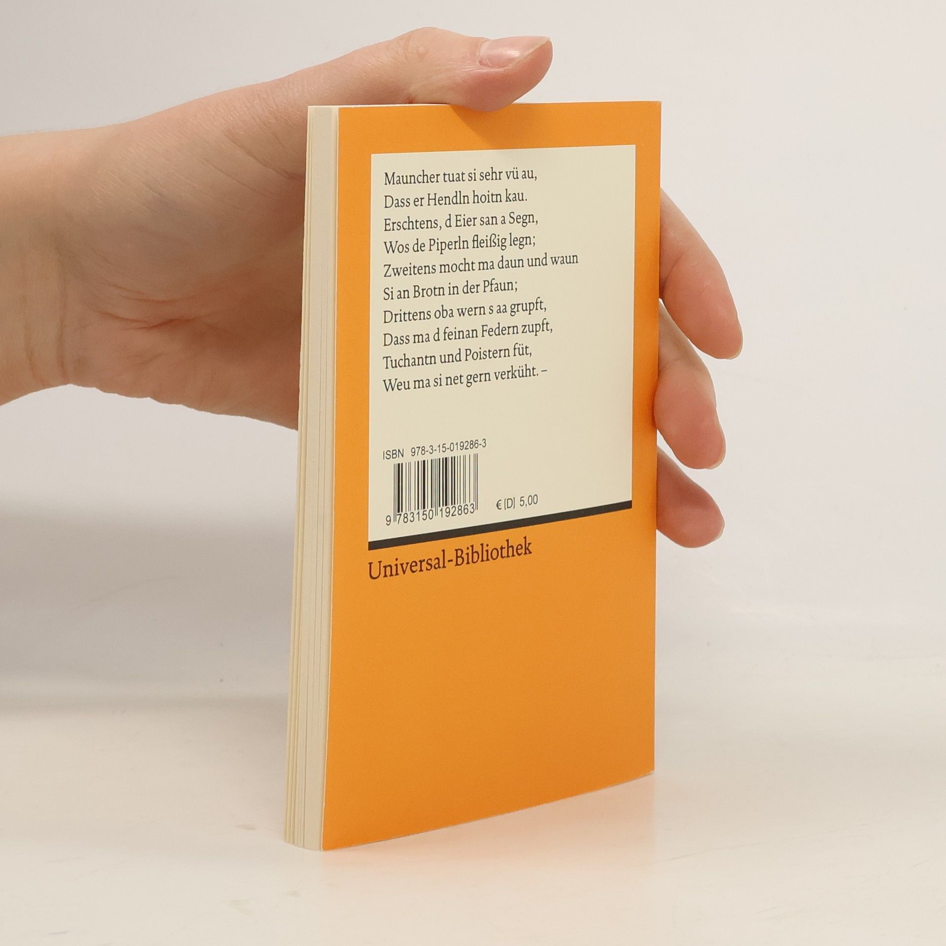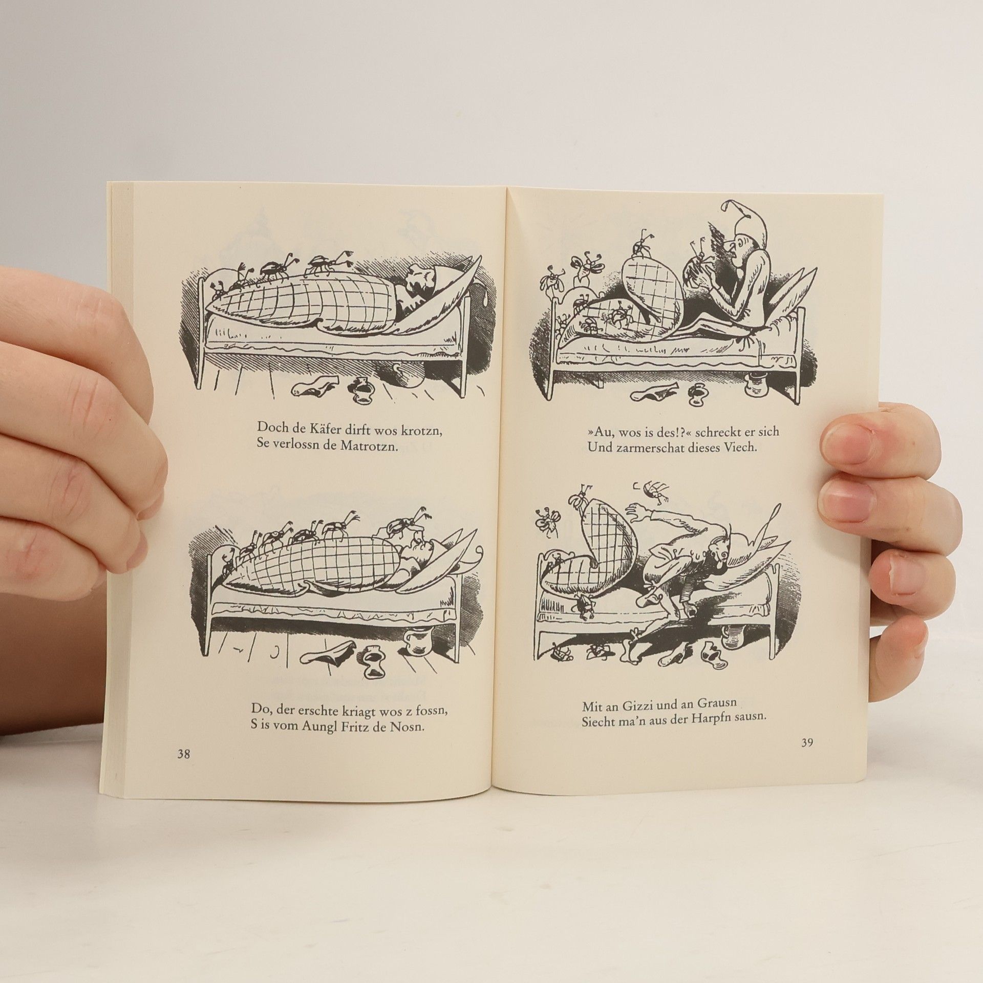So lesen sich die Streiche der beiden Spitzbuben im Wiener Dialekt! Mauncher tuat si sehr vü au, Daß er Hendln hoitn kau. Erschtens, d Eier san a Segn, Wos de Piperln fleißig legn; Zweitens mocht ma daun und waun Si an Brotn in der Pfaun; Drittens oba wern s aa grupft, Daß ma d feinan Federn zupft, Tuchantn und Poistern füt, Weu ma si net gern verküht.