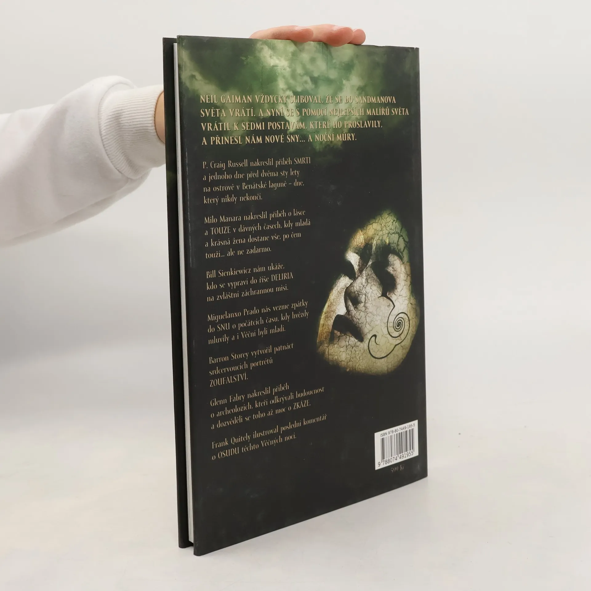 Sedm Věčných sourozenců, sedm příběhů, sedm kreslířů... Neil Gaiman vždycky sliboval, že se do Sandmanova světa vrátí. A nyní se s pomocí nejlepších malířů světa vrátil k sedmi postavám, které ho proslavily, a přinesl nám nové sny… a noční můry. P. Craig Russell nakreslil příběh SMRTI a jednoho dne před dvěma sty lety na ostrově v Benátské laguně - dne, který nikdy nekončí. Milo Manara nakreslil příběh o lásce a TOUZE v dávných časech, kdy mladá a krásná žena dostane vše, po čem touží… ale ne zadarmo. Bill Sienkiewicz nám ukáže, kdo se vypraví do říše DELIRIA na zvláštní záchrannou misi. Miguelanxo Prado nás vezme zpátky do SNU o počátcích času, kdy hvězdy mluvily a i Věční byli mladí. Barron Storey vytvořil patnáct srdcervoucích portrétů ZOUFALSTVÍ. Glenn Fabry nakreslil příběh o archeolozích, kteří odkrývali budoucnost a dozvěděli se toho až moc o ZKÁZE. Frank Quitely ilustroval poslední komentář o OSUDU těchto Věčných nocí.