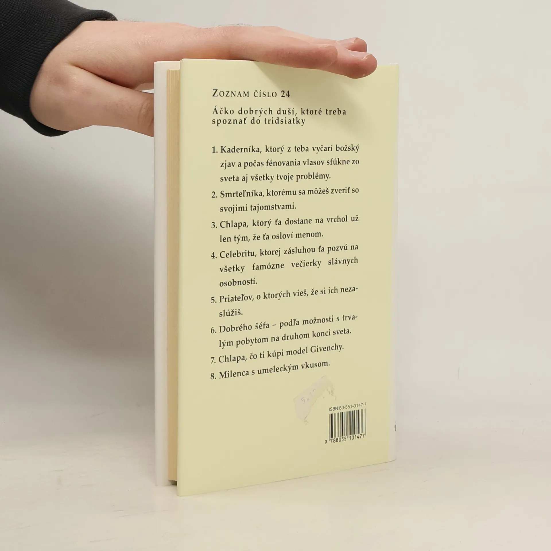 Saskia našla záľubu v písaní zoznamov, napríklad - čo by chcela dosiahnuť do tridsiatky... je to možno neuveriteľné, no Saskiine zoznamy sa zaslúžia o mnoho... Zoznam číslo 24: Áčko dobrých duší, ktoré treba spoznať do tridsiatky 1. Kaderníka, ktorý z teba vyčarí božský zjav a počas fénovania vlasov sfúkne zo sveta aj tvoje problémy. 2. Smrteľníka, ktorému sa môžem zveriť so svojimi tajomstvami. 3. Chlapa, ktorý ťa dostane na vrchol už len tým, že ťa osloví menom. 4. Celebritu, ktorej zásluhou ťa pozvú na všetky famózne večierky slávnych osobností. 5. Priateľov, o ktorých vieš, že si ich nezaslúžiš. 6. Dobrého šéfa - podľa možnosti s trvalým pobytom na druhom konci sveta. 7. Chlapa, ktorý ti kúpi model Givenchy. 8. Milenca s umeleckým vkusom. V tejto veselej knižočke produkuje autorka komické postrehy plné šťavy. Určite by si ju malo prečítať každé moderné dievča.