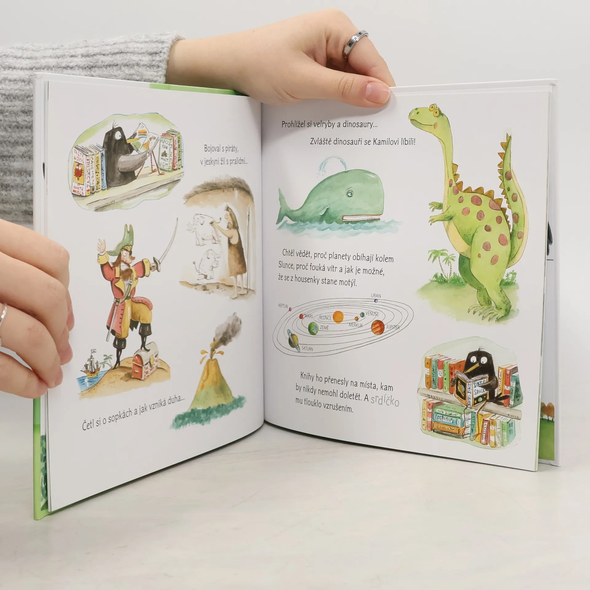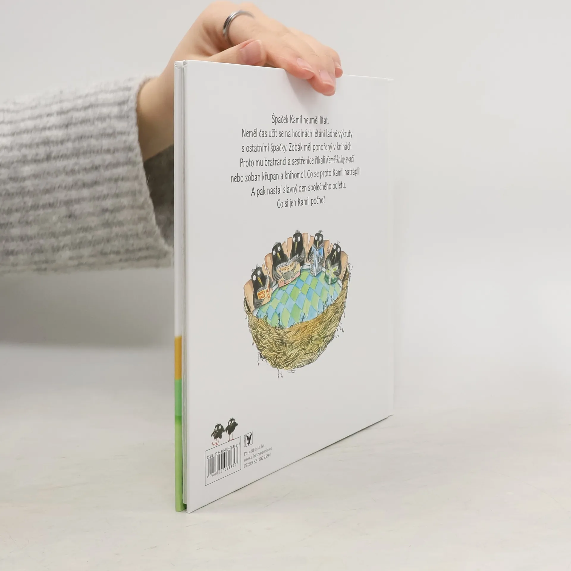 Špaček Kamil neuměl lítat. Neměl čas učit se na hodinách létání ladné výkruty s ostatními bratranci a sestřenicemi. Zobák měl ponořený v knihách. Proto mu bratranci a sestřenice říkali Kamil-knihy svačil nebo zoban křupan a knihomol. Co se kvůli tomu Kamil natrápil! A pak přišel slavný den společného odletu. Co si jen Kamil počne?