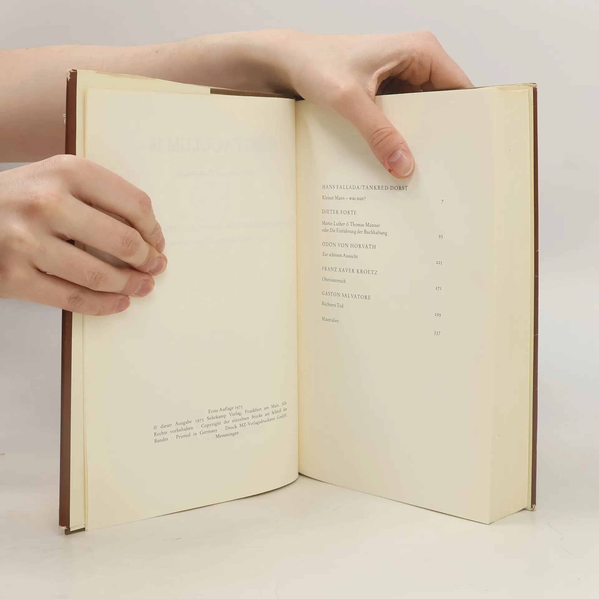 HANS FALLADA/TANKRED DORST, Kleiner Mann - was nun?. DIETER FORTE, Martin Luther & Thomas Münzer oder Die Einführung der Buchhaltung. ÖDÖN VON HORVÁTH, Zur schönen Aussicht. FRANZ XAVER KROETZ, Oberösterreich. GASTON SALVATORE, Büchners Tod.
