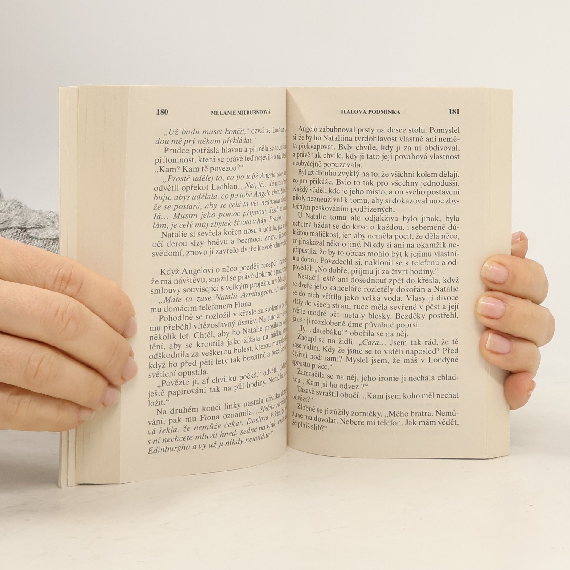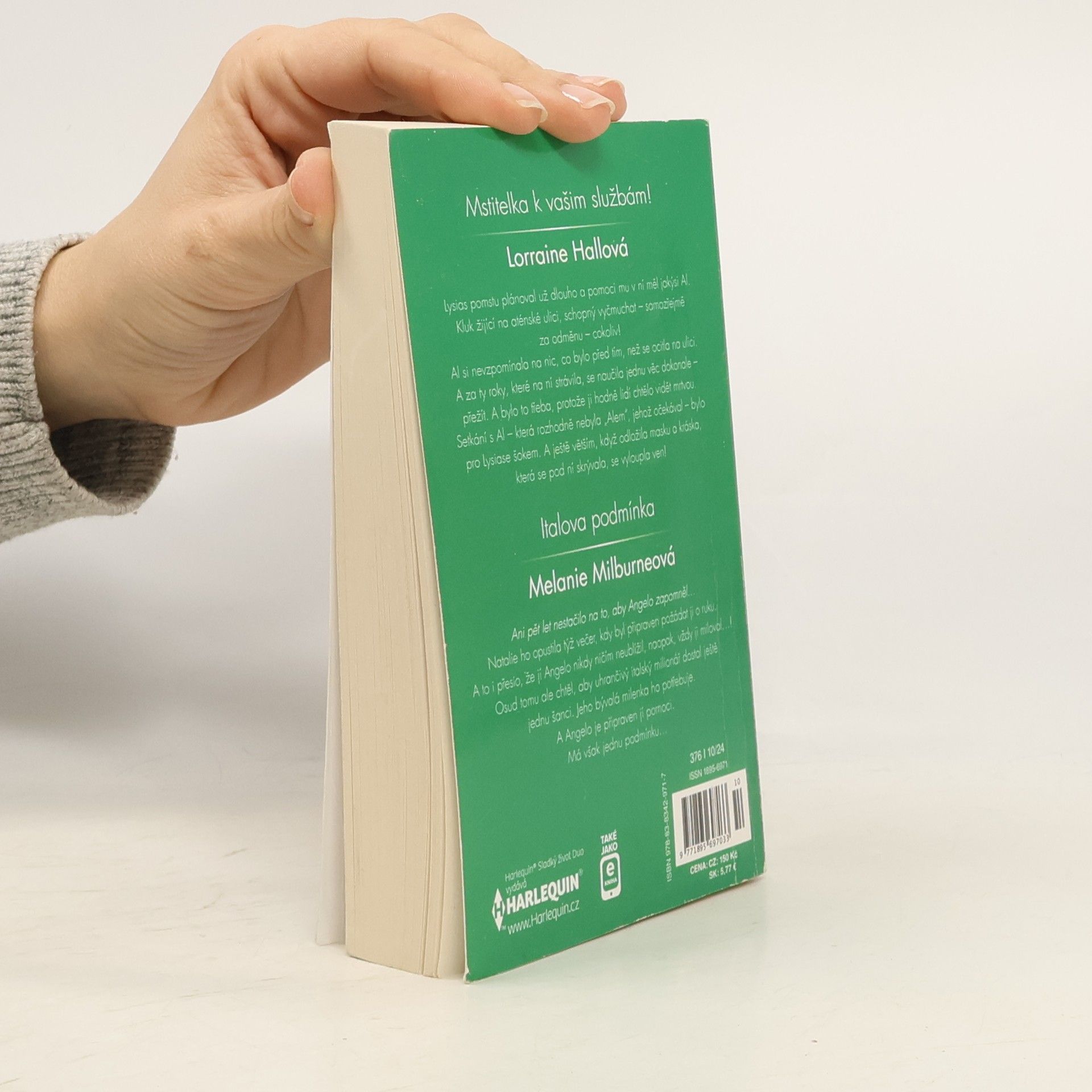 Mstitelka k vašim službám! Lysias pomstu plánoval už dlouho a pomoci mu v ní měl jakýsi Al. Kluk žijící na aténské ulici, schopný vyčmuchat – samozřejmě za odměnu – cokoliv! Al si nevzpomínala na nic, co bylo před tím, než se ocitla na ulici. A za ty roky, které na ní strávila, se naučila jednu věc dokonale – přežít. A bylo to třeba, protože ji hodně lidí chtělo vidět mrtvou. Setkání s Al – která rozhodně nebyla „Alem“, jehož očekával – bylo pro Lysiase šokem. A ještě větším, když odložila masku a kráska, která se pod ní skrývala, se vyloupla ven! Italova podmínka: Ani pět let nestačilo na to, aby Angelo zapomněl… Natalie ho opustila týž večer, kdy byl připraven požádat ji o ruku. A to i přesto, že jí Angelo nikdy ničím neublížil, naopak, vždy ji miloval… ! Osud tomu ale chtěl, aby uhrančivý italský milionář dostal ještě jednu šanci. Jeho bývalá milenka ho potřebuje. A Angelo je připraven jí pomoci. Má však jednu podmínku…