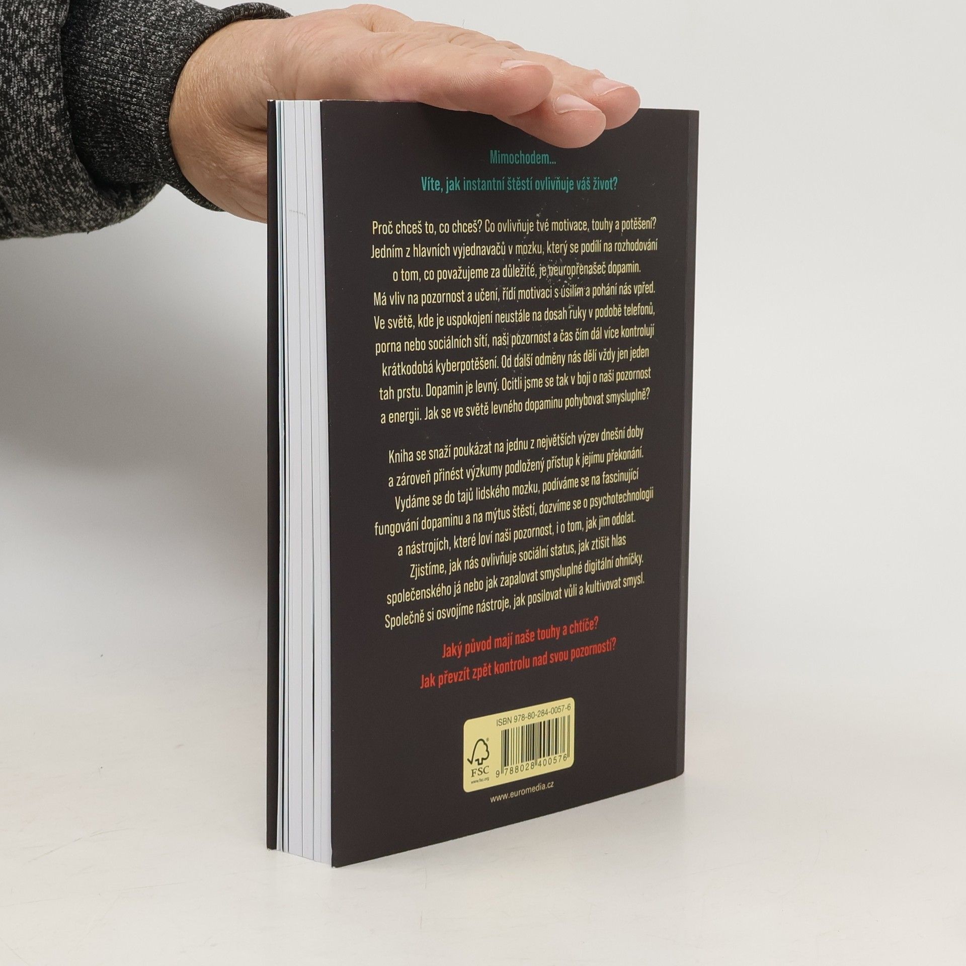 Proč chceš to, co chceš? Co ovlivňuje tvé motivace, touhy a potěšení? Jedním z hlavních vyjednavačů v mozku, který se podílí na rozhodování o tom, co považujeme za důležité, je neuropřenašeč dopamin. Má vliv na pozornost a učení, řídí motivaci s úsilím a pohání nás vpřed. V evoluční historii byl dopamin drahý ? na cestě za odměnou bylo nutné vyvinout úsilí a překonat překážky. Dnes je tomu jinak. Ve světě, kde je uspokojení neustále na dosah ruky v podobě telefonů, porna nebo sociálních sítí, naši pozornost a čas čím dál více kontrolují krátkodobá kyberpotěšení. Od další odměny nás dělí vždy jen jeden tah prstu. Dopamin je levný. Ocitli jsme se tak v boji o naši pozornost a energii. Jak se ve světě levného dopaminu pohybovat smysluplně? Kniha se snaží poukázat na jednu z největších výzev dnešní doby a zároveň přinést výzkumy podložený přístup k jejímu překonání. Vydáme se do tajů lidského mozku, podíváme se na fascinující fungování dopaminu a na mýtus štěstí, dozvíme se o psychotechnologii a nástrojích, které loví naši pozornost, i o tom, jak jim odolat. Zjistíme, jak nás ovlivňuje sociální status, jak ztišit hlas společenského já nebo jak zapalovat smysluplné digitální ohníčky. Společně si osvojíme nástroje, jak posilovat vůli a kultivovat smysl.
