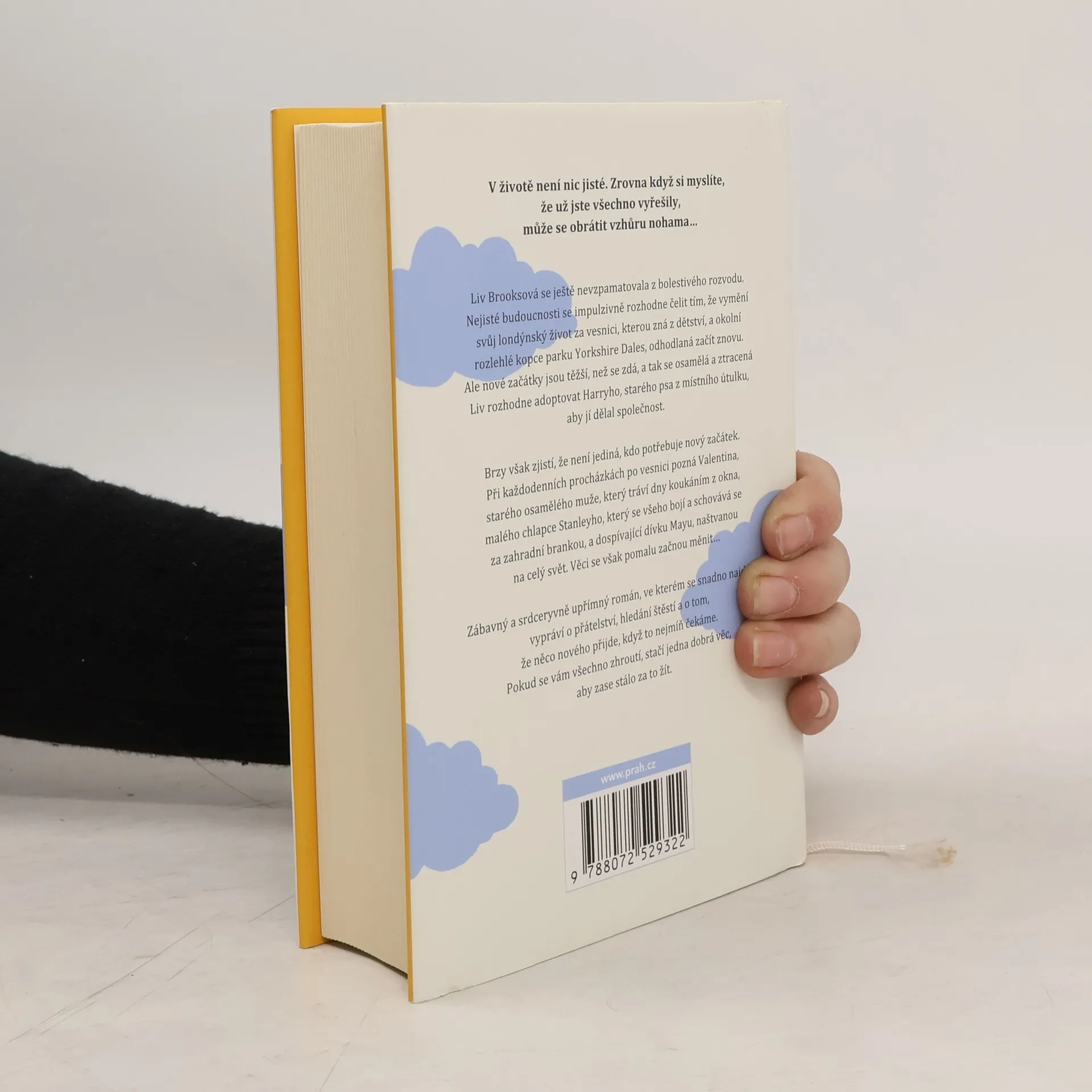 V životě není nic jisté. Zrovna když si myslíte, že už jste všechno vyřešily, může se obrátit vzhůru nohama… Liv Brooksová se ještě nevzpamatovala z bolestivého rozvodu. Nejisté budoucnosti se impulzivně rozhodne čelit tím, že vymění svůj londýnský život za vesnici, kterou zná z dětství, a okolní rozlehlé kopce parku Yorkshire Dales, odhodlaná začít znovu. Ale nové začátky jsou těžší, než se zdá, a tak se osamělá a ztracená Liv rozhodne adoptovat Harryho, starého psa z místního útulku, aby jí dělal společnost. Brzy však zjistí, že není jediná, kdo potřebuje novy´ začátek. Při každodenních procházkách po vesnici pozná Valentina, starého osamělého muže, který tráví dny koukáním z okna, malého chlapce Stanleyho, který se všeho bojí a schovává se za zahradní brankou, a dospívající dívku Mayu, naštvanou na cely´ svět. Věci se však pomalu začnou měnit… Zábavný a srdceryvně upřímný román, ve kterém se snadno najdete, vypráví o přátelství, hledání štěstí a o tom, že něco nového přijde, když to nejmíň čekáme. Pokud se vám všechno zhroutí, stačí jedna dobrá věc, aby zase stálo za to žít.