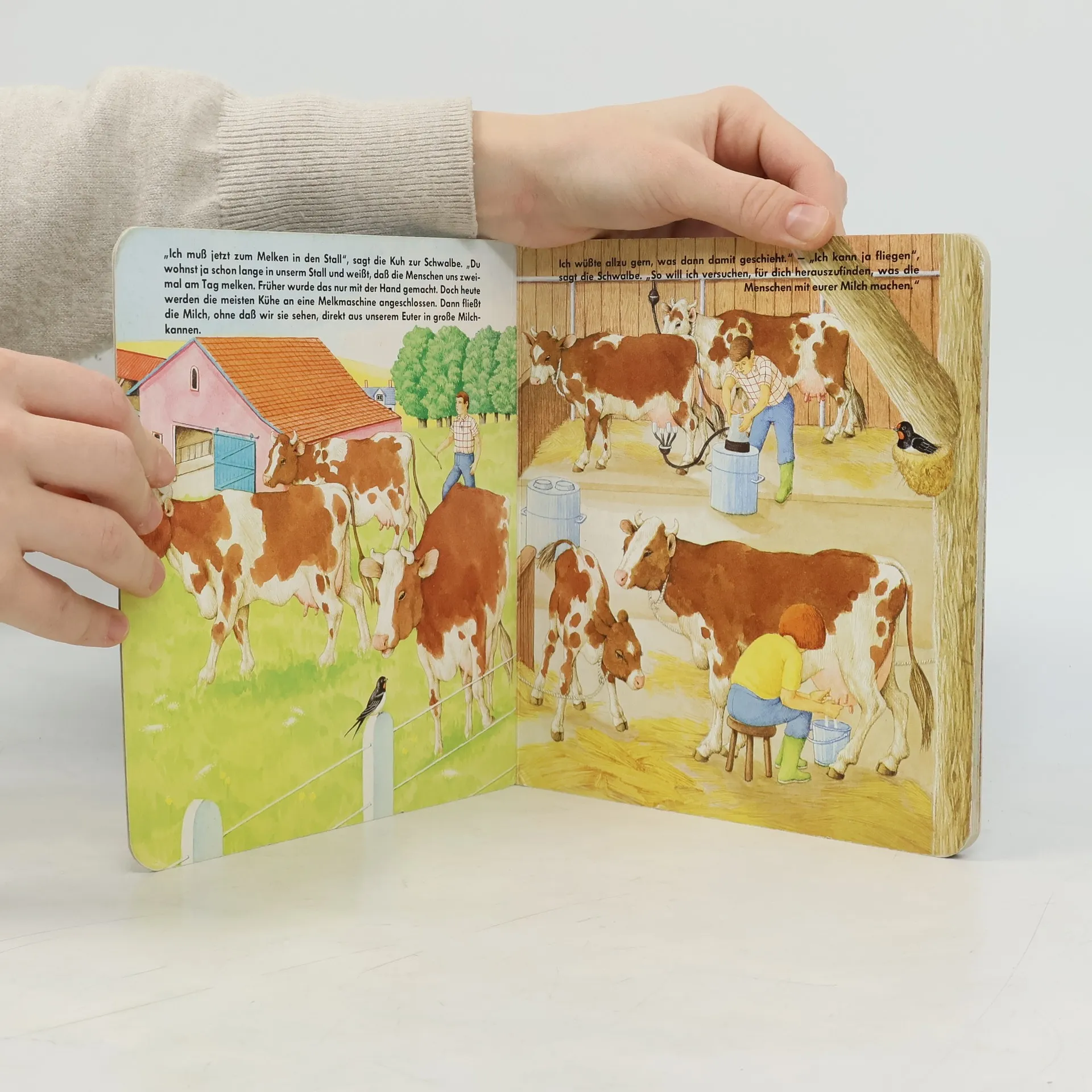 Eine Kuh möchte wissen, was nach dem Melken mit ihrer Milch geschieht. Eine Schwalbe fliegt dem Milchwagen hinterher, um es für sie herauszufinden.