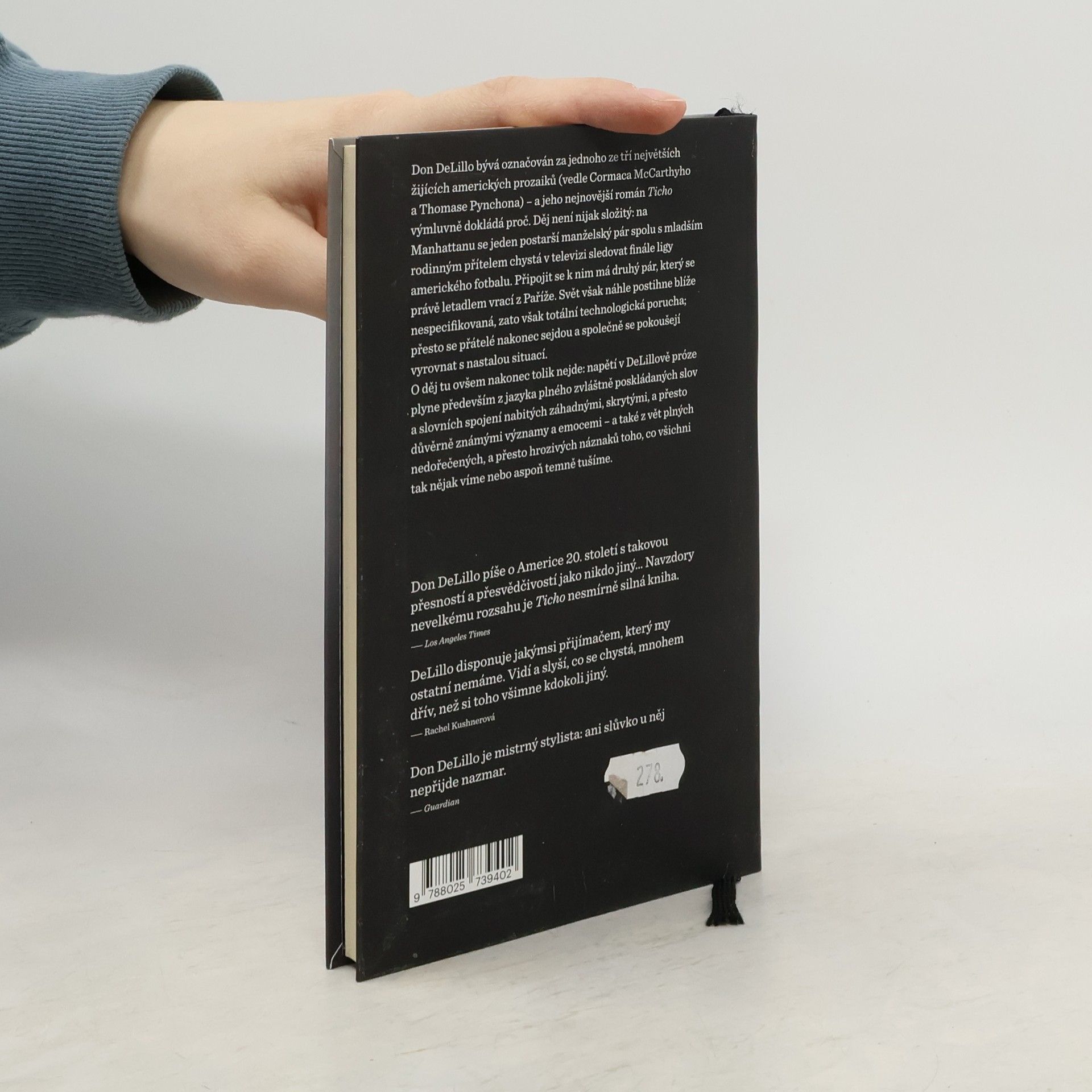 Don DeLillo bývá označován za jednoho ze tří největších žijících amerických prozaiků (vedle Cormaca McCarthyho a Thomase Pynchona) – a jeho poslední kniha, útlý román Ticho, výmluvně dokládá proč. Děj není nijak složitý: na Manhattanu se jeden postarší manželský pár spolu s mladším rodinným přítelem chystá v televizi sledovat Super Bowl, tedy finále ligy amerického fotbalu. Připojit se k nim má druhý pár, který se právě letadlem vrací z Paříže. Svět však náhle postihne blíže nespecifikovaná, zato však totální technologická porucha; přesto se přátelé nakonec sejdou a společně se pokoušejí vyrovnat s nastalou situací, přičemž kolísají mezi paranoidním přesvědčením, že nastává konec světa, a pochybnostmi, jestli veškeré tyto obavy a úzkosti nejsou jen přemrštěnou, hluboce iracionální reakcí na tuctový výpadek proudu. O děj ovšem nakonec tolik nejde: napětí v DeLillově próze neplyne z děje, ale z jazyka plného zvláštně poskládaných slov a slovních spojení nabitých záhadnými, skrytými, a přesto důvěrně známými významy a emocemi – a taky z vět plných nedořečených, a přesto hrozivých náznaků toho, co všichni tak nějak víme nebo aspoň temně tušíme.