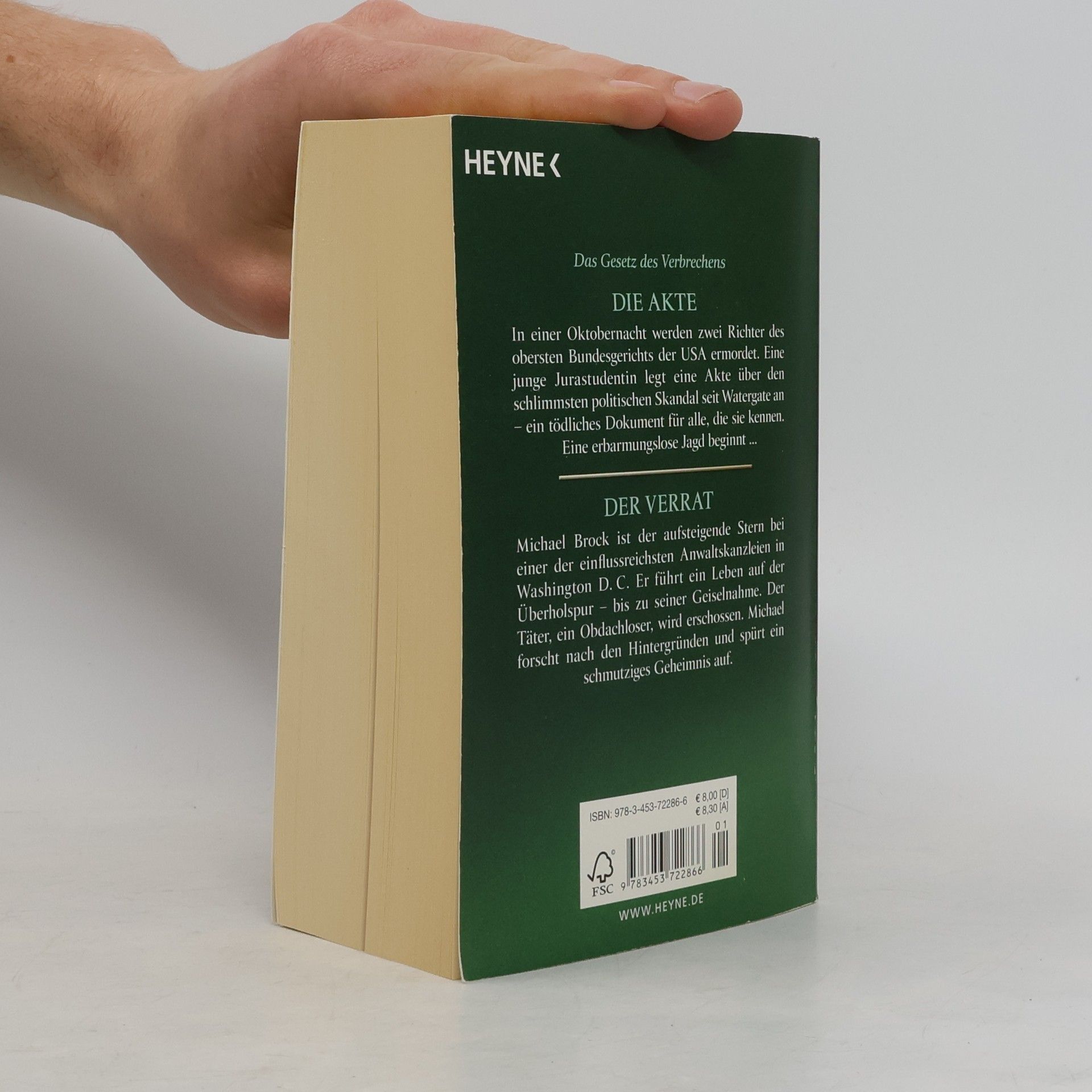 Die Akte: Eine junge Jurastudentin legt eine Akte über den schlimmsten politischen Skandal seit Watergate an - ein tödliches Dokument. Der Verrat: Michael Brock ist der aufsteigende Stern bei einer einflussreichen Anwaltskanzlei in Washington D. C. Er führt ein Leben auf der Überholspur, bis eine Geiselnahme sein Leben vollkommen verändert. Der Geiselnehmer, ein herunterkommener Obdachloser, wird erschossen. Michael forscht nach den Hintergründen diser Tat und spürt ein schmutziges Geheimnis auf...