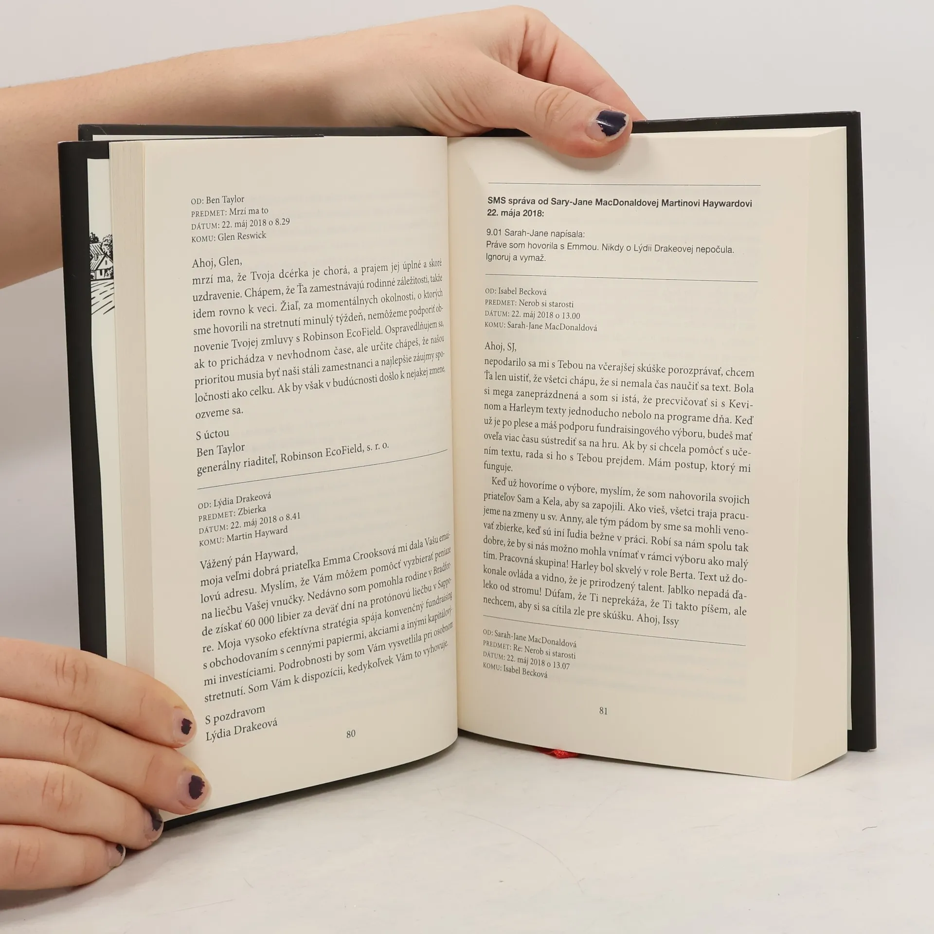 Hlavní aktéri miestneho divadelného združenia sa dozvedia zdrvujúcu správu. Ich vnučka má rakovinu. Členovia divadelného spolku zorganizujú finančnú zbierku, no vzápätí sa vynárajú pochybnosti o dobrom úmysle niektorých z jej organizátorov. Spor vyvrcholí vraždou, podozrivý je zatknutý a čaká na súd. Autorka poskytuje čitateľovi možnosť zapojiť sa do práce dvojice právnikov a pomocou e-mailov a správ, ktoré sú hlavným nosičom deja, odhaliť, kto je skutočným vrahom.