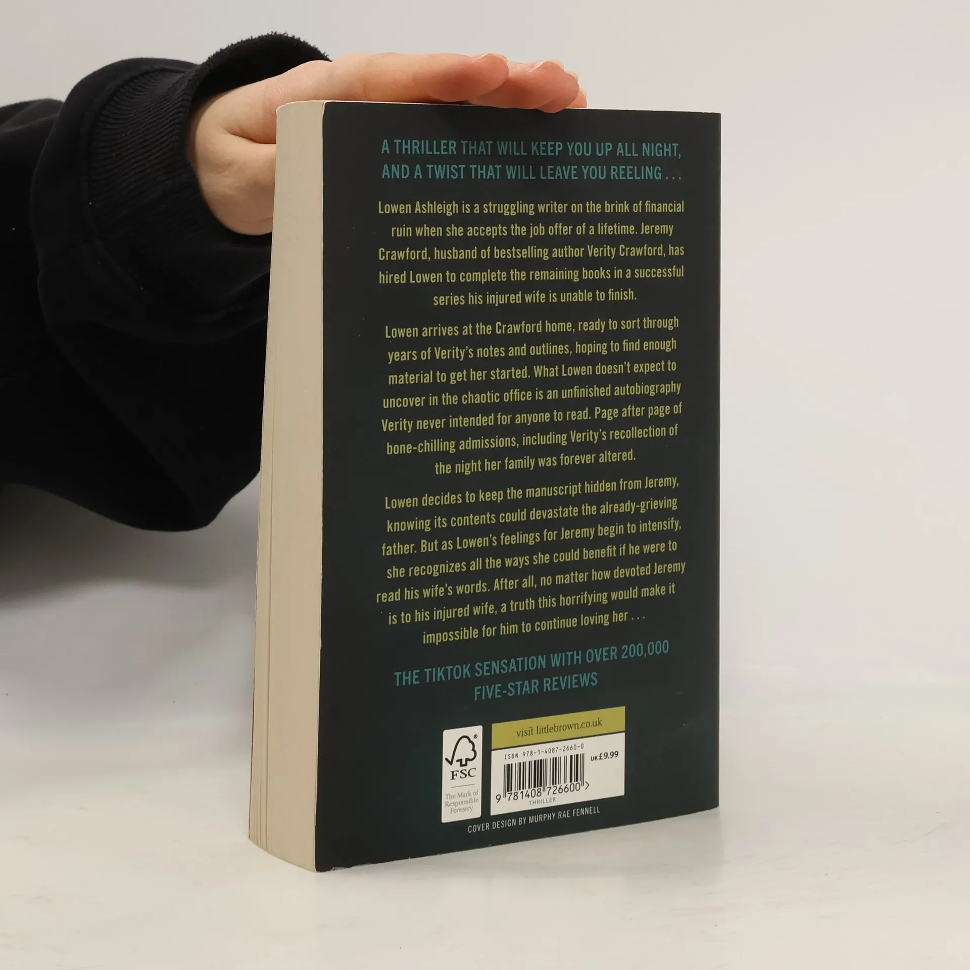 A thriller that will keep you up all night, and a twist that will leave you reeling... Lowen Ashleigh is a struggling writer on the brink of financial ruin when she accepts the job offer of a lifetime. Jeremy Crawford, husband of bestselling author Verity Crawford, has hired Lowen to complete the remaining books in a successful series his injured wife is unable to finish. Lowen arrives at the Crawford home, ready to sort through years of Verity's notes and outlines, hoping to find enough material to get her started. What Lowen doesn't expect to uncover in the chaotic office is an unfinished autobiography Verity never intended for anyone to read. Page after page of bone-chilling admissions, including Verity's recollection of the night their family was forever altered. Lowen decides to keep the manuscript hidden from Jeremy, knowing its contents would devastate the already-grieving father. But as Lowen's feelings for Jeremy begin to intensify, she recognizes all the ways she could benefit if he were to read his wife's words. After all, no matter how devoted Jeremy is to his injured wife, a truth this horrifying would make it impossible for him to continue loving her . . .