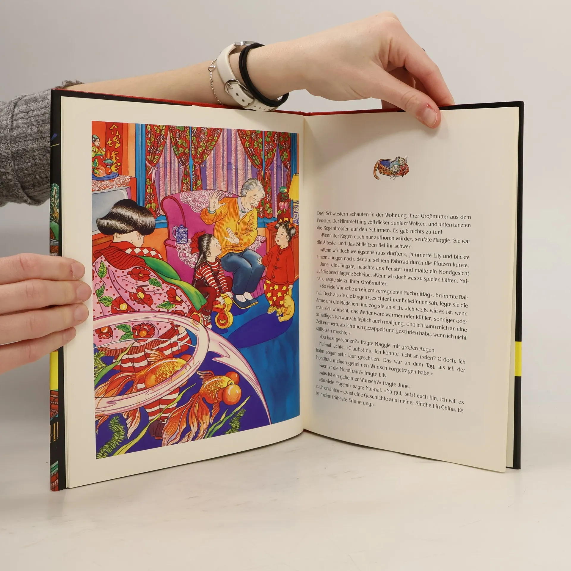 Die chinesische Grossmutter erzählt ihren Enkeln die Geschichte von der Mondfrau, die einmal im Jahr erscheint, um den Menschen ihre geheimsten Wünsche zu erfüllen.