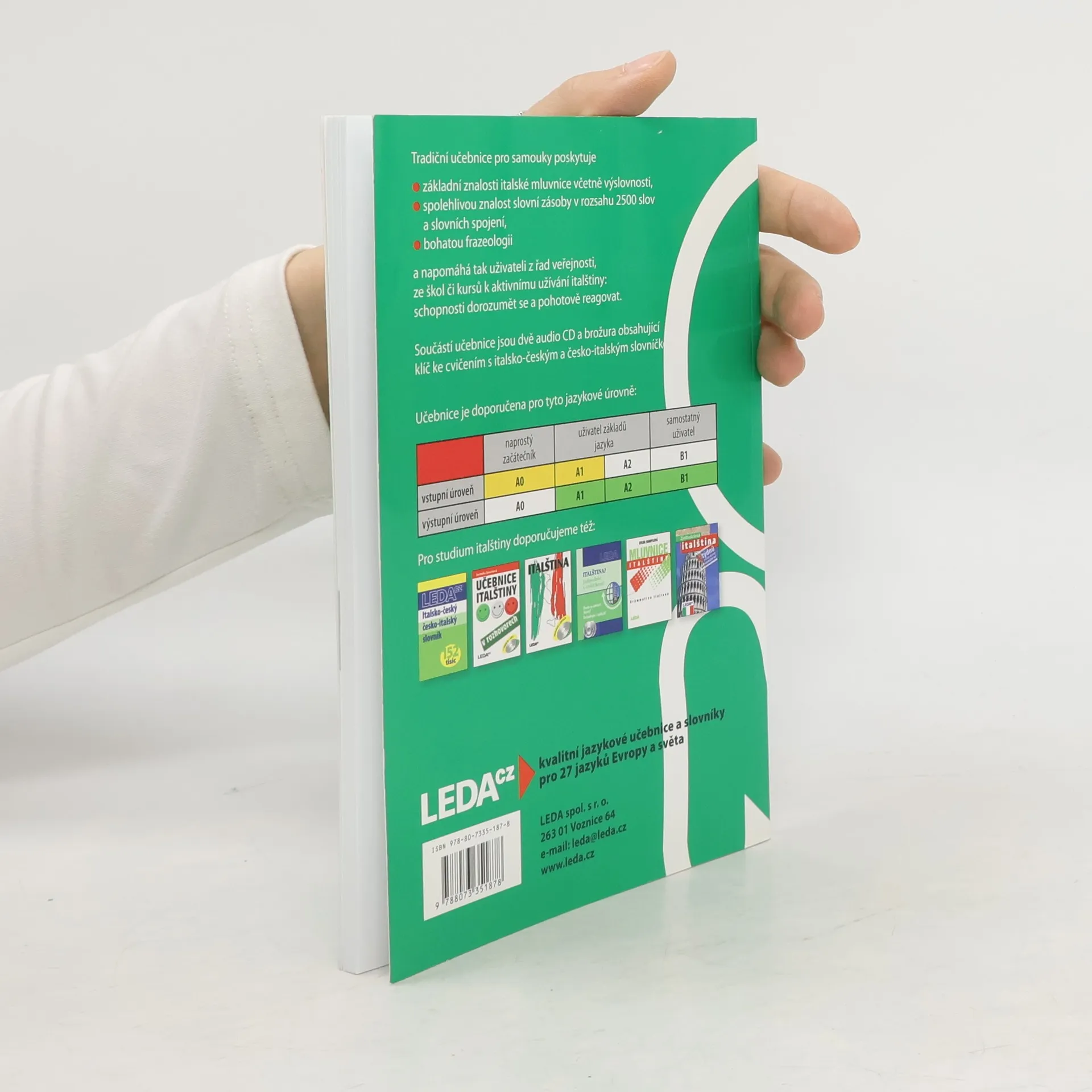 Oblíbená učebnice pro samouky obsahuje italskou mluvnici, slovní zásobu v rozsahu asi 2500 slov, frazeologii a výslovnost. Důraz je kladen na aktivní užívání italštiny, schopnost dorozumět se a pohotově reagovat v nejčastějších situacích. Každou lekci uzavírají kvizy, které mají vzbudit zájem uživatele o kulturu Itálie. Učebnice je určena také pro kursy a školy. Její součástí je klíč ke cvičením s italsko-českým a česko-italským slovníčkem v samostatné brožuře a nahrávka vybraných textů na dvou audio CD.