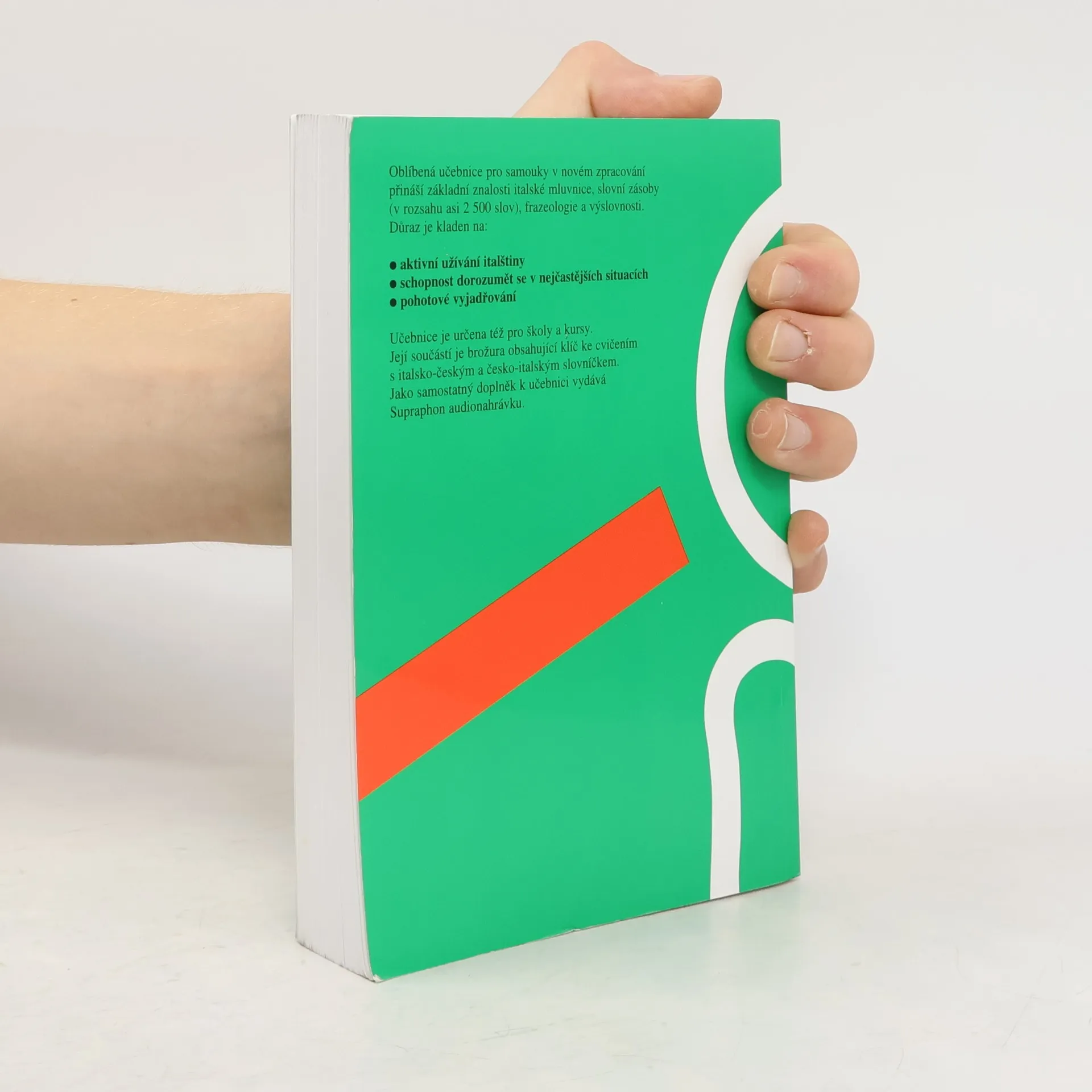 Oblíbená učebnice pro samouky v novém zpracování přináší základní znalosti italské mluvnice, slovní zásoby (v rozsahu asi 2500 slov ), frazeologie a výslovnosti. Důraz je kladen na: aktivní užívání italštiny schopnost dorozumět se v nejčastějších situacích pohotové vyjádřováníUčebnice je určena též pro školy a kursy. Její součásti je brožura obsahující klíč ke cvičením s italsko-českým a česko-italským slovníčkem. Jako samostatný doplněk vydává Supraphon audionahrávku.