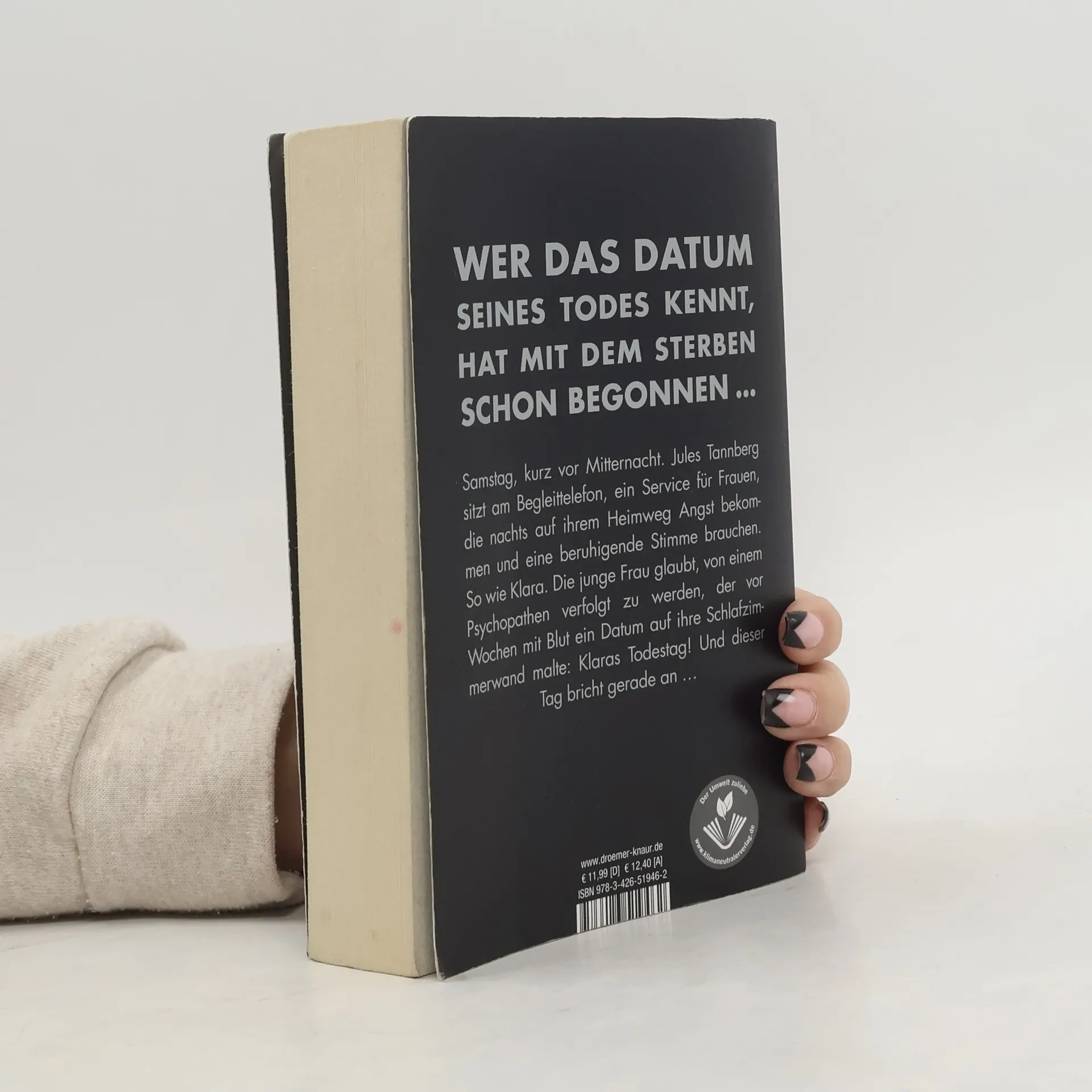 Wer das Datum seines Todes kennt, hat mit dem Sterben schon begonnen – dieser Bestseller von Sebastian Fitzek ist nichts für schwache Nerven! Es ist Samstag, kurz nach 22.00 Uhr. Jules Tannberg sitzt am Begleit-Telefon. Ein ehrenamtlicher Telefon-Service für Frauen, die zu später Stunde auf ihrem Heimweg Angst bekommen und sich einen telefonischen Begleiter wünschen, dessen beruhigende Stimme sie sicher durch die Berliner Nacht nach Hause führt - oder im Notfall Hilfe ruft. Noch nie gab es eine wirklich lebensgefährliche Situation. Bis heute, als Jules mit Klara spricht. Die junge Frau hat entsetzliche Angst. Sie glaubt, von einem Mann verfolgt zu werden, der sie schon einmal überfallen hat und der mit Blut ein Datum auf ihre Schlafzimmerwand malte: Klaras Todestag! Und dieser Tag bricht in nicht einmal zwei Stunden an ... Ein Serienmörder auf freiem Fuß  – geheimnisvoll, beklemmend, nervenaufreibend: Einer der spannendsten Thriller aus der Feder des Bestsellerautors Sebastian Fitzek „Eines vermag dieser Autor wie kein Zweiter: eine Spannung aufzubauen, die zum Schluss schon fast als schmerzhaft empfunden wird.“ krimi-couch