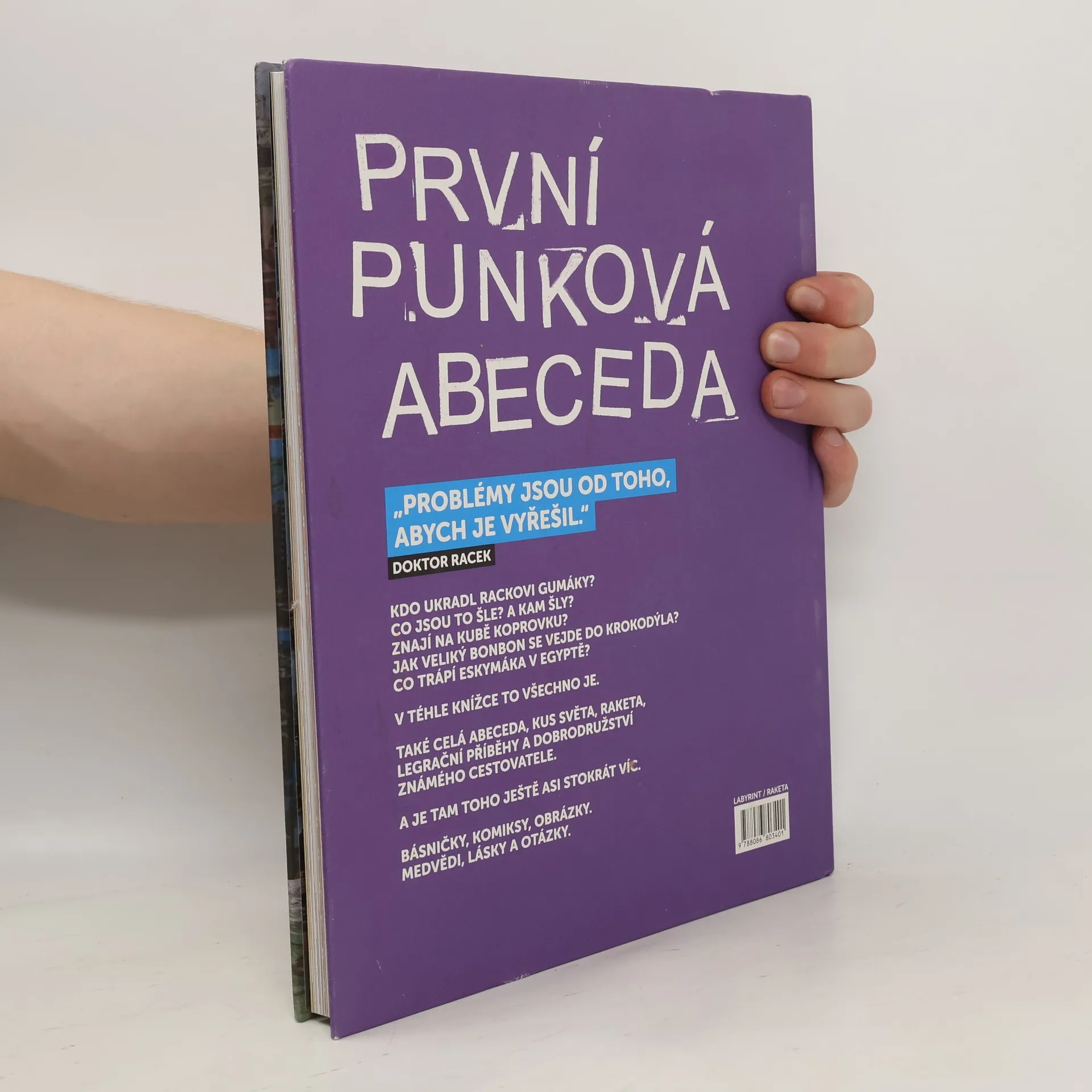 První punková abeceda Doktor Racek sedá do rakety a vydává se na cestu kolem zeměkoule. Navštěvuje různé kouty světa a děti se při tom učí písmena. Kniha jako gejzír nápadů vedle hravé formy obsahuje i vzdělávací prvky. Básničky, komiksy, koláže, krátké pohádky, hry, otázky a úkoly. Pro všechny děti a jejich skvělé rodiče. Nikdo se nebude ani vteřinu nudit! Kdo ukradl Rackovi gumáky? Co jsou šle? A kam šly? Znají na Kubě koprovku? Jak veliký bonbon se vejde do krokodýla? Co trápí Eskymáka v Egyptě? V téhle knížce je všechno – celá abeceda, kus světa, raketa, legrační příběhy a dobrodružství známého cestovatele.