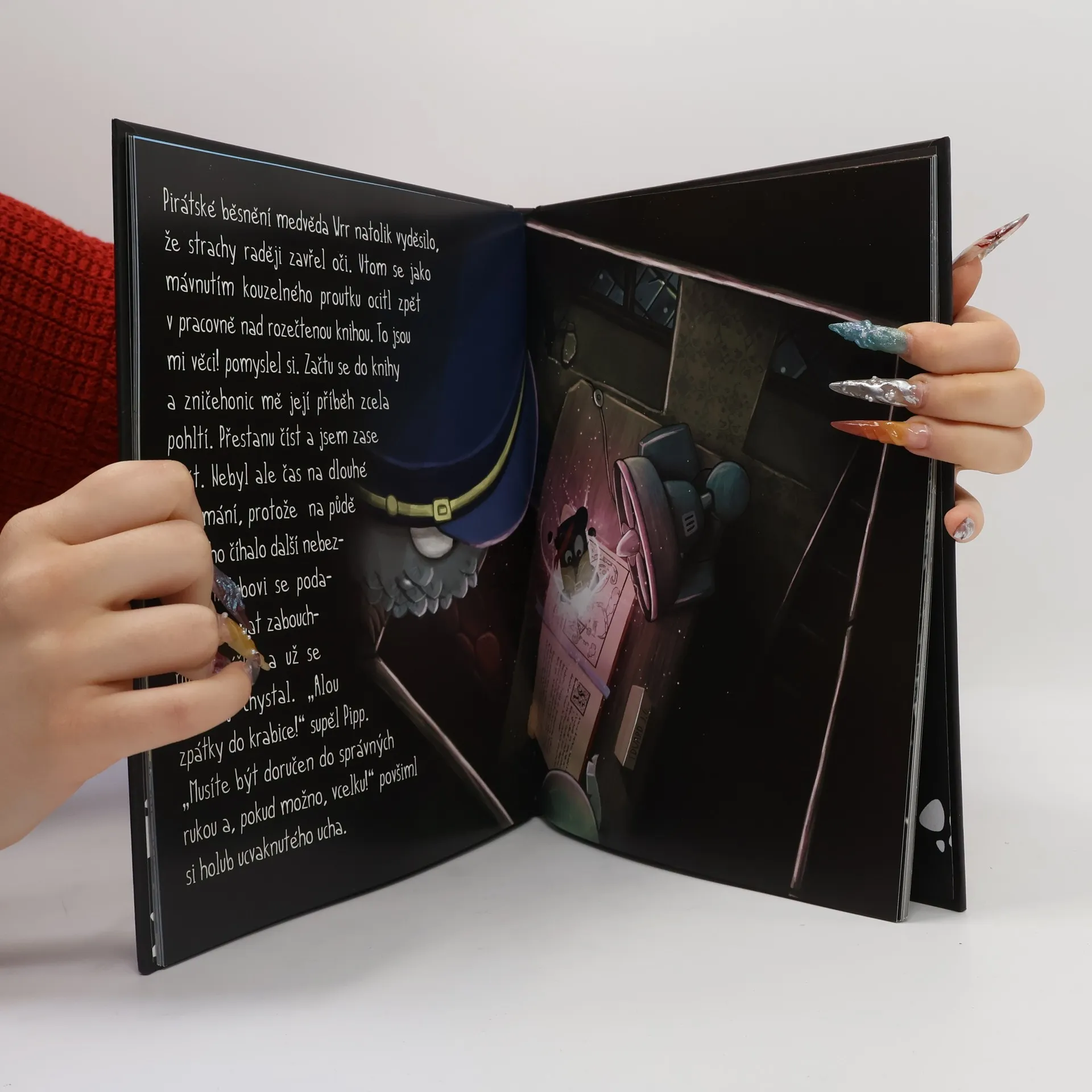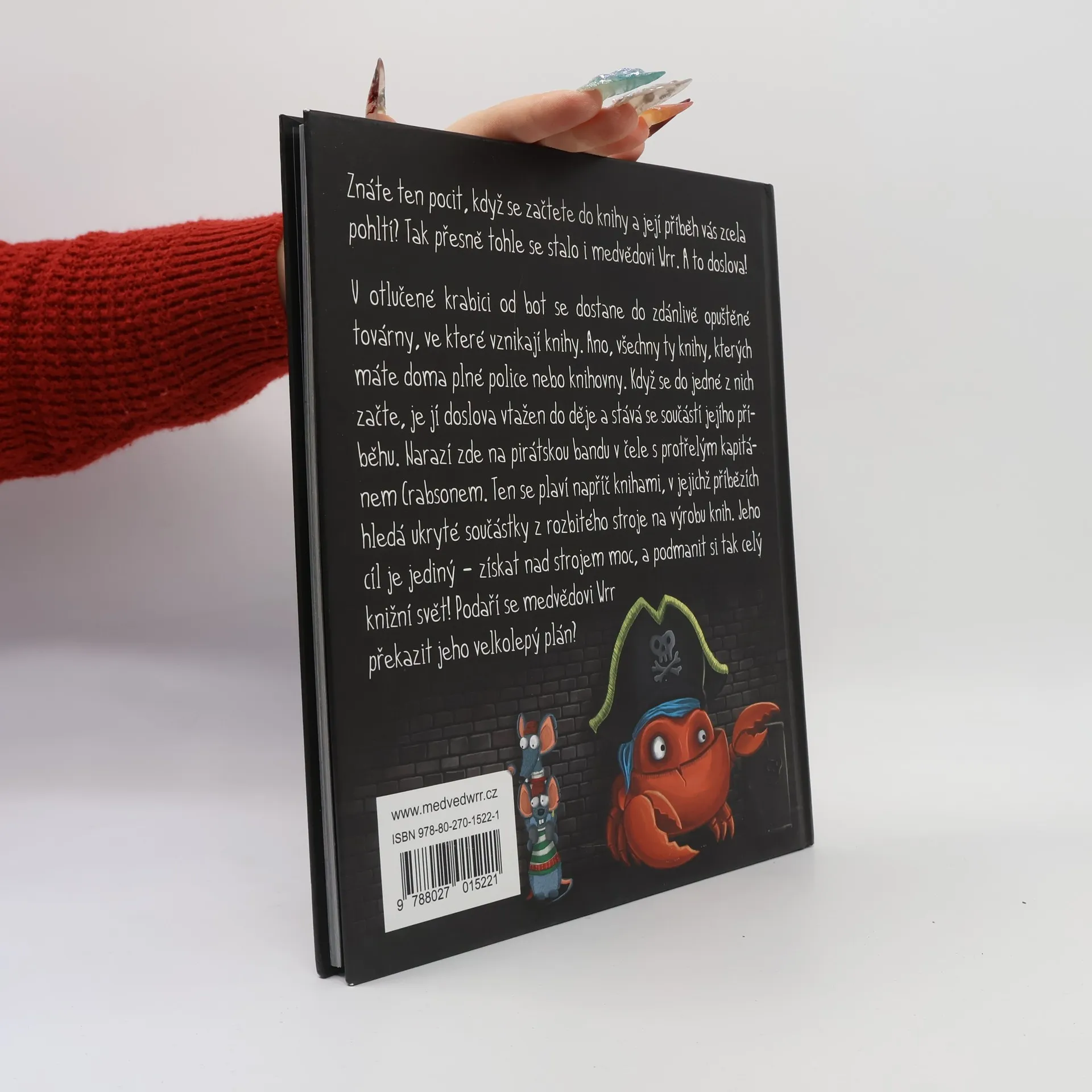 O čem kniha vypráví: "Znáte ten pocit, když se začtete do knihy a její příběh Vás zcela pohltí? Tak přesně tohle se stalo i medvědovi Wrr. A to doslova! V otlučené krabici od bot se dostane do zdánlivě opuštěné továrny, ve které vznikají knihy. Ano, všechny ty knihy, kterých máte doma plné police nebo knihovny. Když se do jedné z nich začte, je doslova vtažen do děje a stává se součástí jejího příběhu. Narazí zde na pirátskou bandu v čele s protřelým kapitánem Crabsonem. Ten se plaví napříč knihami, v jejichž příbězích hledá ukryté součástky z rozbitého stroje na výrobu knih. Jeho cíl je jediný – získat nad vynálezem moc a podmanit si tak celý knižní svět! Podaří se medvědovi Wrr překazit jeho ničemný plán?"