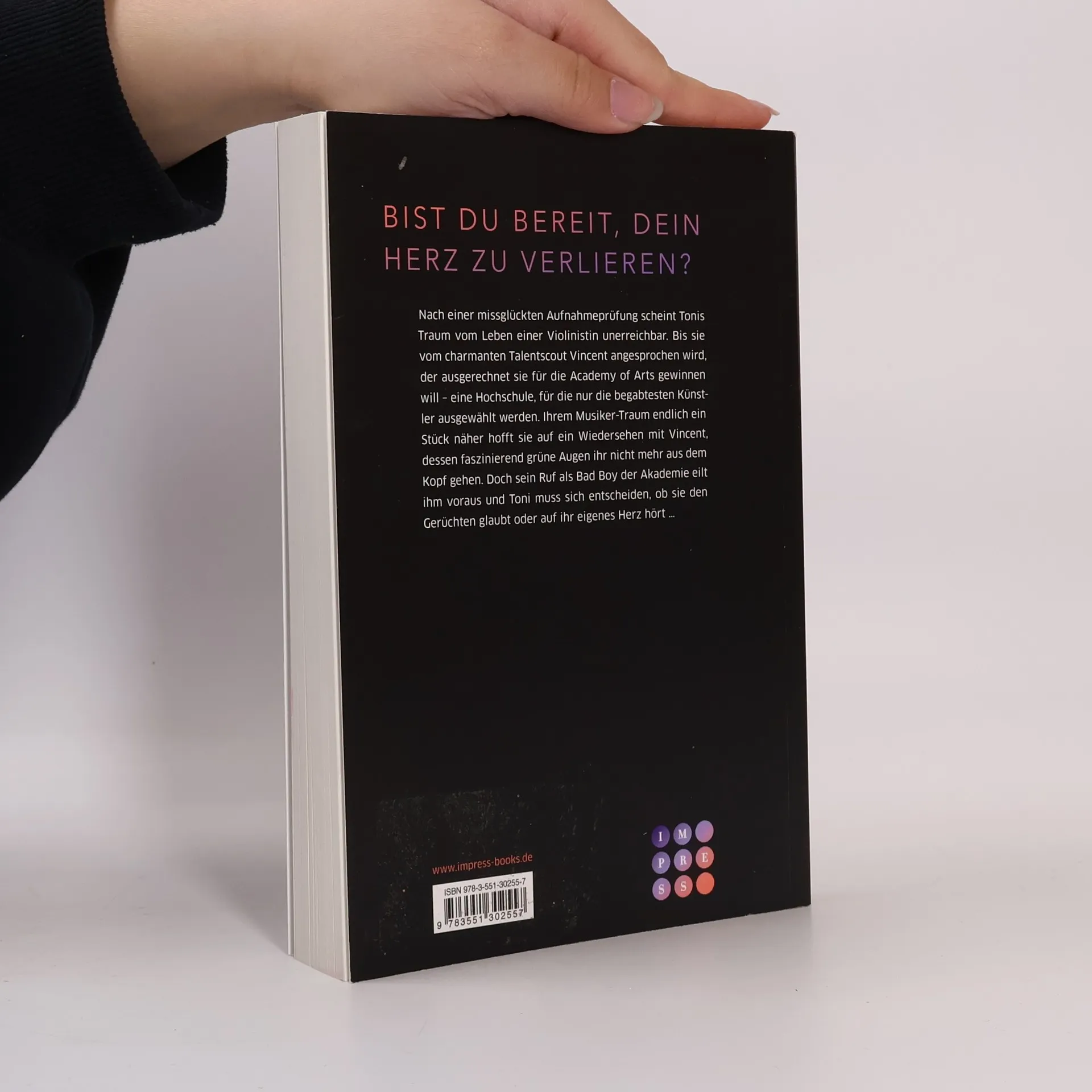 Toni kämpft nach einer misslungenen Aufnahmeprüfung um ihren Traum als Violinistin. Als der charmante Talentscout Vincent sie für die Academy of Arts gewinnen will, wird sie von seinen grünen Augen und seinem Bad Boy-Ruf verunsichert. Sie muss entscheiden, ob sie den Gerüchten glaubt oder ihrem Herzen folgt. Eine fesselnde New Adult-Romance!