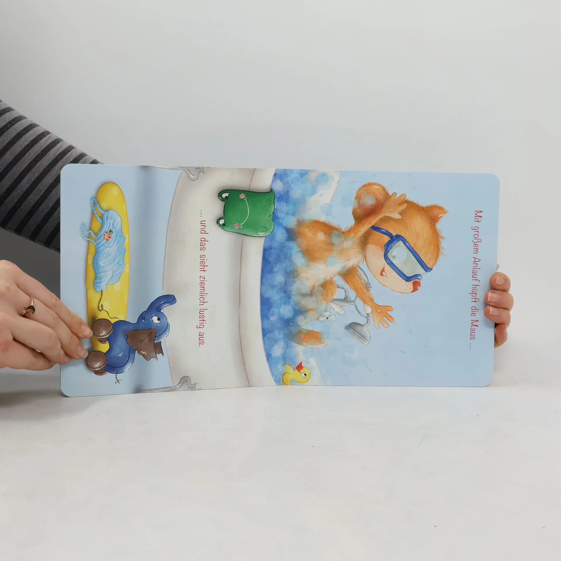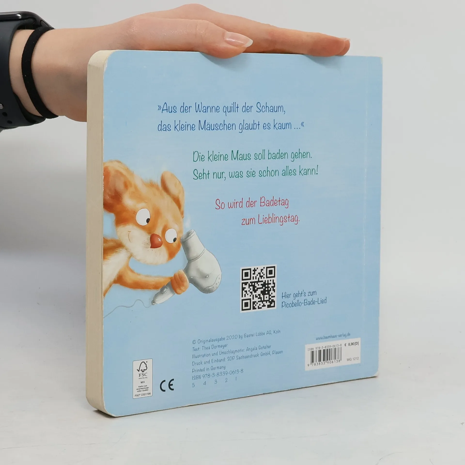 Die kleine Maus hat keine Lust auf den Badetag und versteckt sich, doch Mama Maus bringt sie schließlich zum Baden. In der Wanne hat sie viel Spaß und erlebt lustige Momente. Ein süßes Pappbilderbuch mit witzigen Versen und einem Bade-Lied zum Mitsingen.