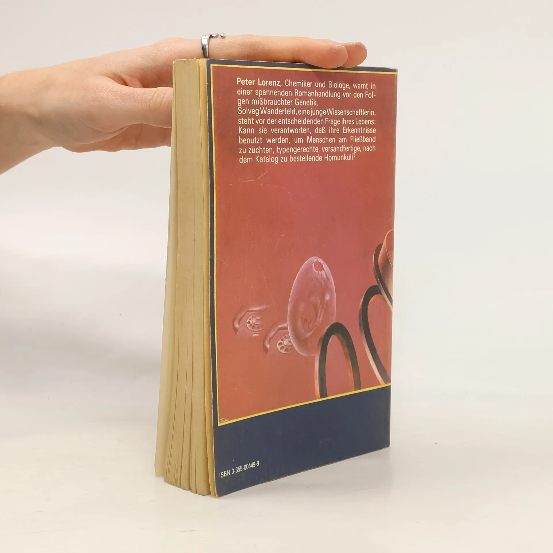 Peter Lorenz, Chemiker und Biologe, warnt in einer spannenden Romanhandlung vor den Folgen missbrauchter Genetik. Solveg Wanderfeld, eine junge Wissenschaftlerin, steht vor der entscheidenen Frage ihres Lebens: Kann sie verantworten, dass ihre Erkenntnisse benutzt werden, um Menschen am Fliessband zu züchten, typengerechte, versandfertige, nach dem Katalog zu bestellende Homunkuli?