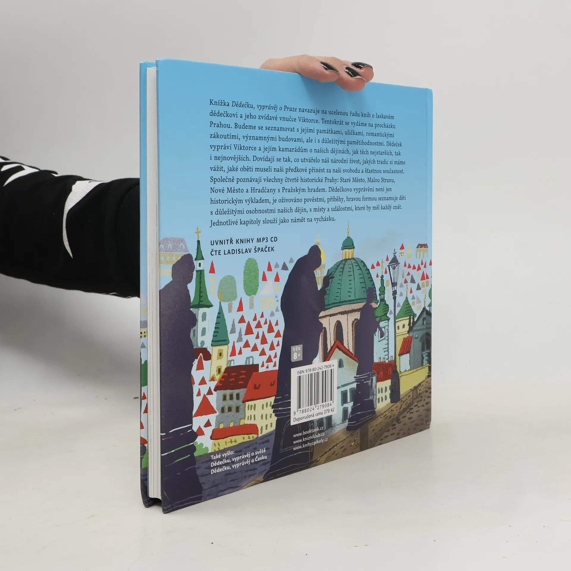 Knížka Dědečku, vyprávěj o Praze navazuje na ucelenou řadu knih o laskavém dědečkovi a jeho zvídavé vnučce Viktorce. Tentokrát se vydáme na procházku Prahou. Budeme se seznamovat s jejími památkami, uličkami, romantickými zákoutími, významnými budovami, ale i s důležitými pamětihodnostmi. Dědeček vypráví Viktorce a jejím kamarádům o našich dějinách, jak těch nejstarších, tak i nejnovějších. Dovídají se tak, co utvářelo náš národní život, jakých tradic si máme vážit, jaké oběti museli naši předkové přinést za naši svobodu a šťastnou současnost. Společně poznávají všechny čtvrtě historické Prahy: Staré Město, Malou Stranu, Nové Město a Hradčany s Pražským hradem. Dědečkovo vyprávění není jen historickým výkladem, je oživováno pověstmi, příběhy, hravou formou seznamuje děti s důležitými osobnostmi našich dějin, s místy a událostmi, které by měl každý znát. Jednotlivé kapitoly slouží jako námět na vycházku. Součástí je audiokniha, již namluvil sám Ladislav Špaček.
