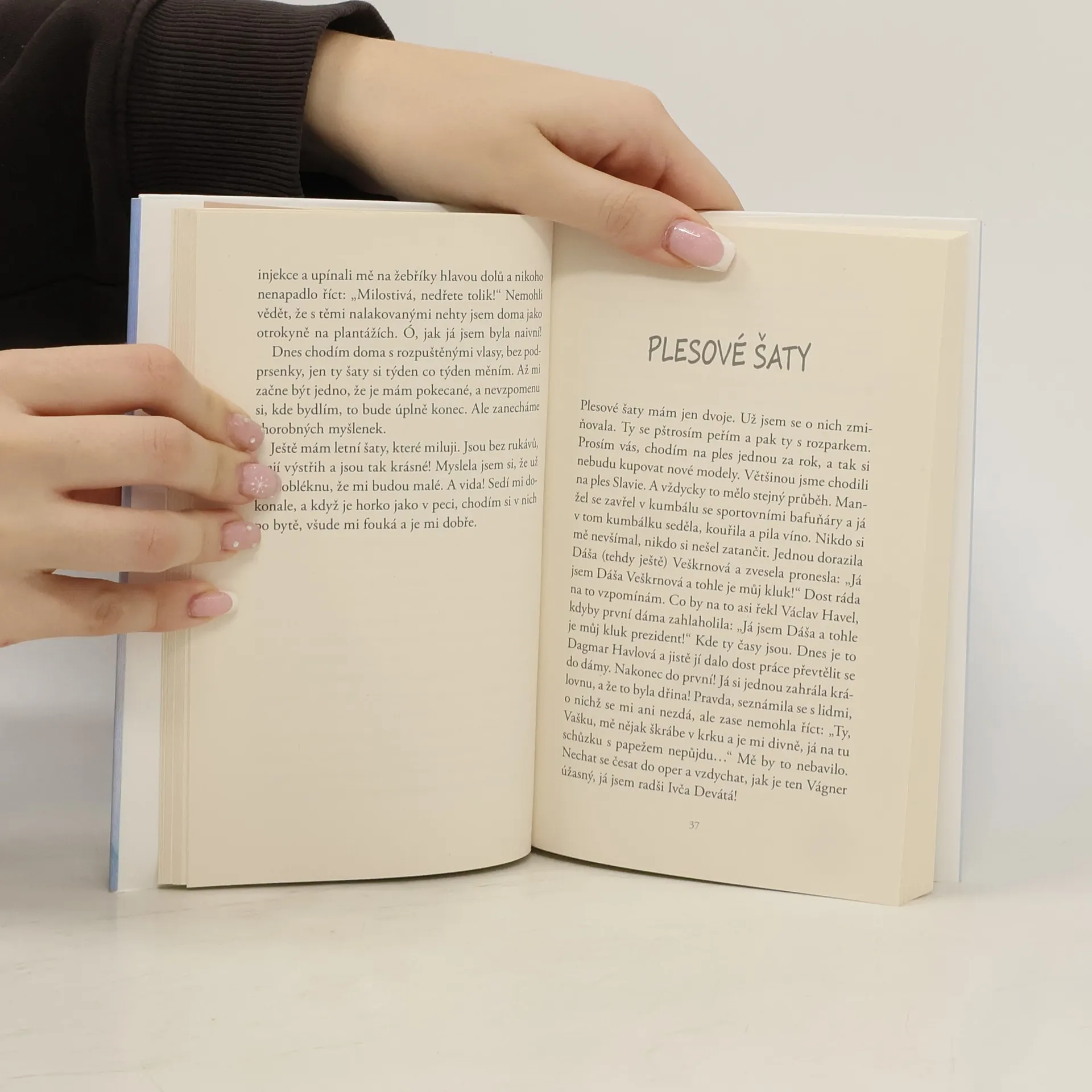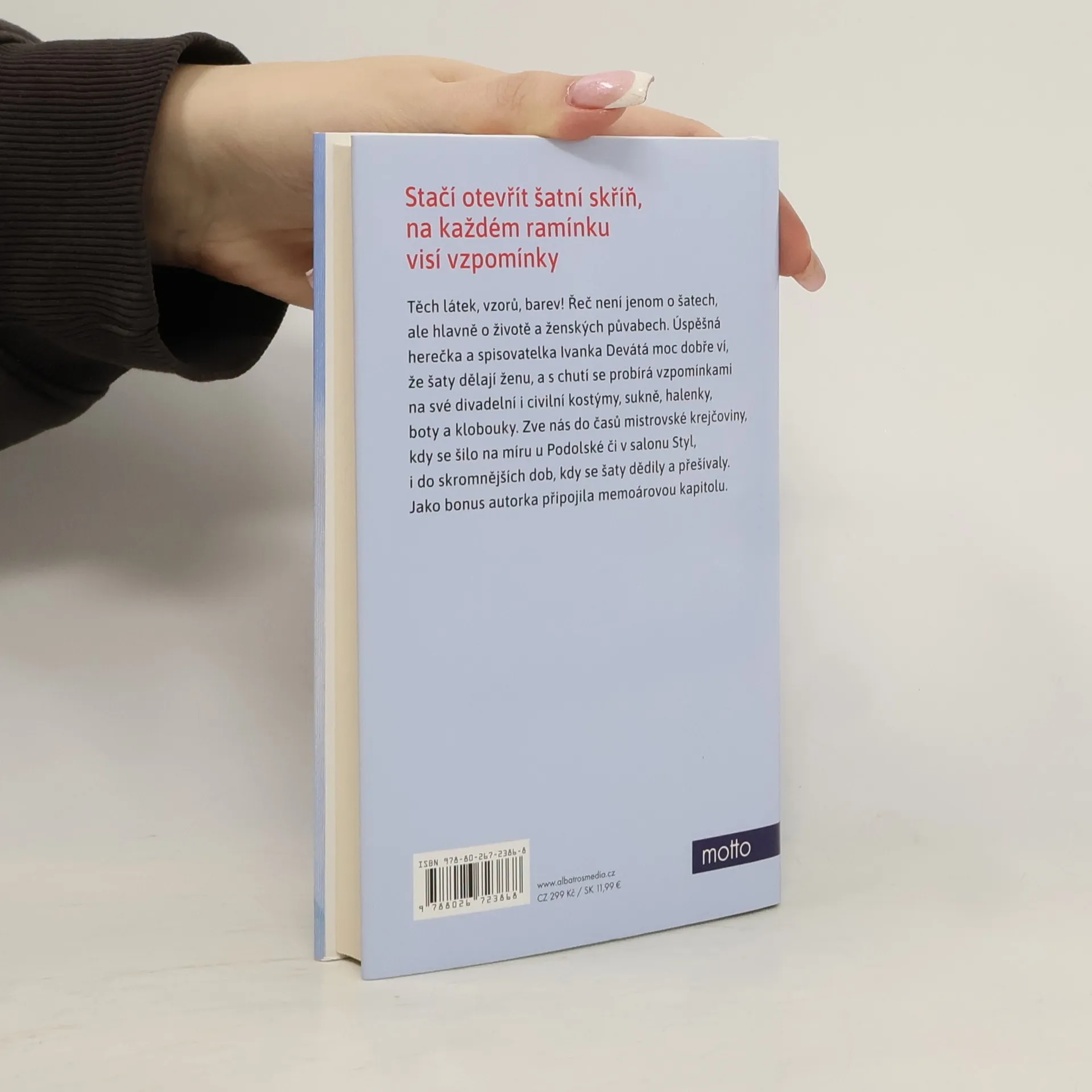 Těch látek, vzorů, barev! Řeč není jenom o šatech, ale hlavně o životě a ženských půvabech. Úspěšná herečka a spisovatelka Ivanka Devátá moc dobře ví, že šaty dělají ženu, a s chutí se probírá vzpomínkami na své divadelní i civilní kostýmy, sukně, halenky, boty a klobouky. Zve nás do časů mistrovské krejčoviny, kdy se šilo na míru u Podolské či v salonu Styl, i do skromnějších dob, kdy se šaty dědily a přešívaly. Jako bonus autorka připojila memoárovou povídku.