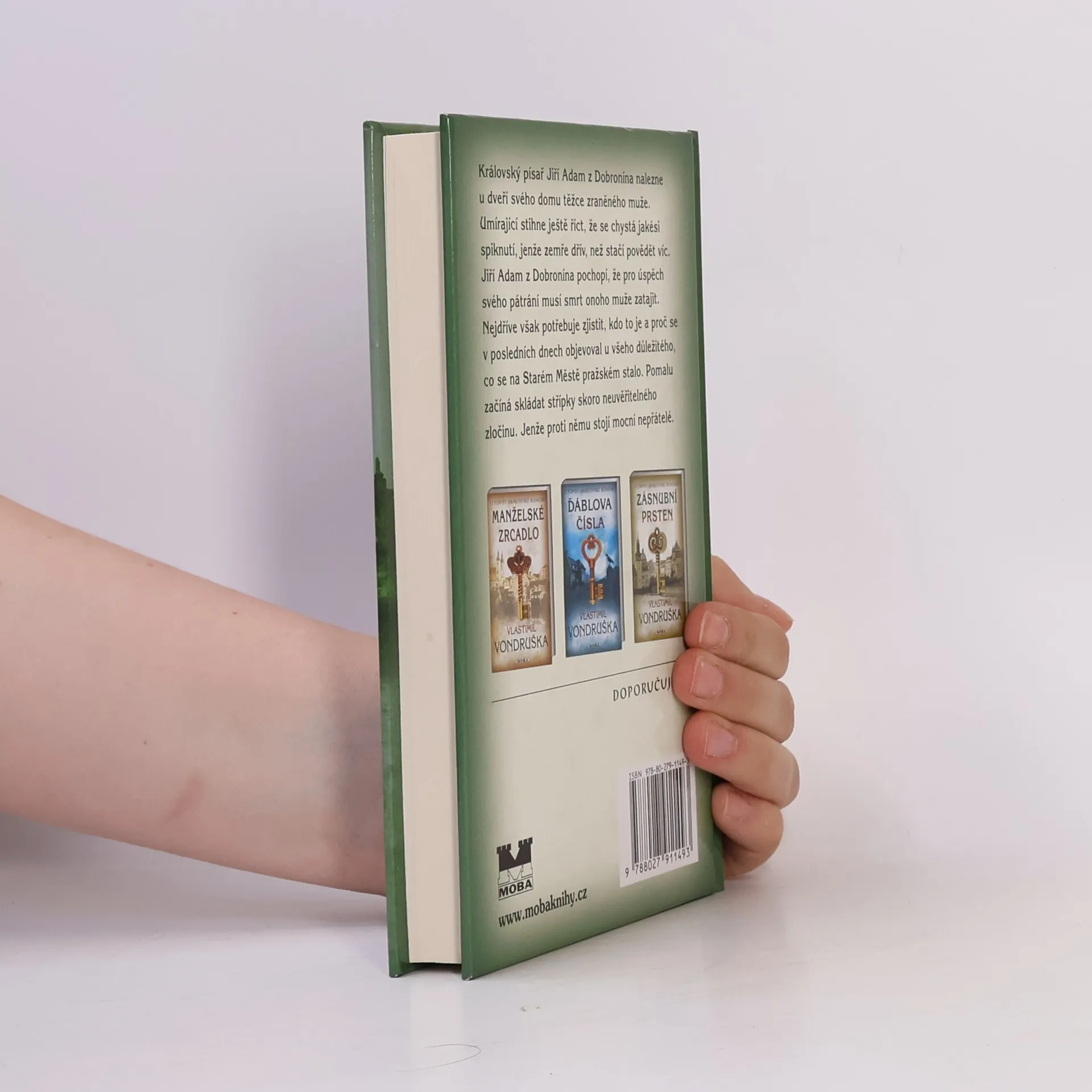 Devátý díl série historických detektivních románů, ve kterých zločiny vyšetřuje královský písař Jiří Adam z Dobronína. Jedné noci je před domem Jiřího Adama z Dobronína v Kaprově ulici na Starém Městě pražském zavražděn muž, který jej týden vytrvale sledoval, stejně jako bakaláře Petra Korce i jeho manželku Rozárku. Před smrtí stačil ještě říct, že byl podveden a že se chystá nějaký zločin. Královský písař se s vydatnou pomocí Petra, Rozárky, jejíž život se ocitne v ohrožení, a přítele, bývalého notáře Ulricha z Jenišova, pouští do pátrání. Odhaluje nečekanou spojitost s případem záhadných vražd v Plzni, kde před několika lety usvědčil pachatele. Mohlo by se jednat o pomstu?