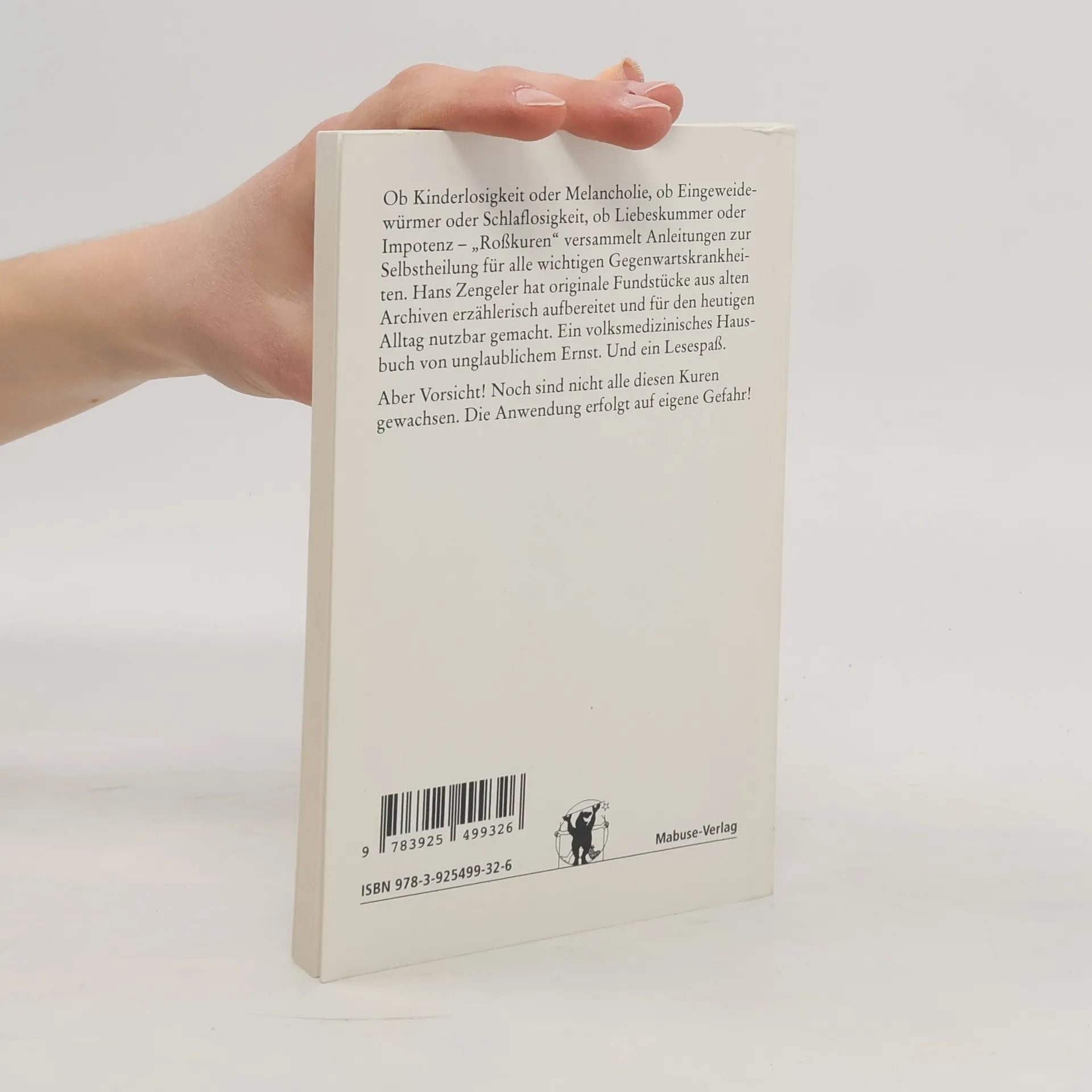 „Woher einen Zahnarzt bekommen, mitten in der Nacht? Jedenfalls ist dies die Zeit und der Umstand, wo man, wie ich meine, bereit ist, eine Roßkur sofort anzuwenden: ‚Gegen sehr heftiges Zahnweh räth man Nachts 12 Uhr oder wenigstens vor Sonnenaufgang auf den Kirchhof zu gehen und in ein Todtenbein zu beißen.’ Etwas ungewöhnlich, ja das schon. Vielleicht auch strafrechtlich bedenklich. Man könnte deswegen verhaftet oder in ein Irrenhaus gebracht werden. Eines aber wäre man mit großer Wahrscheinlichkeit: Vom Zahnweh befreit. Denn jetzt hätte man andere Sorgen.” Hans Zengeler hat originale Anleitungen zur Selbstheilung aus alten Archiven erzählerisch aufbereitet und für den heutigen Alltag nutzbar gemacht. Ein nicht ganz ernst gemeintes, volksmedizinisches Hausbuch und ein unglaublicher Lesespaß.