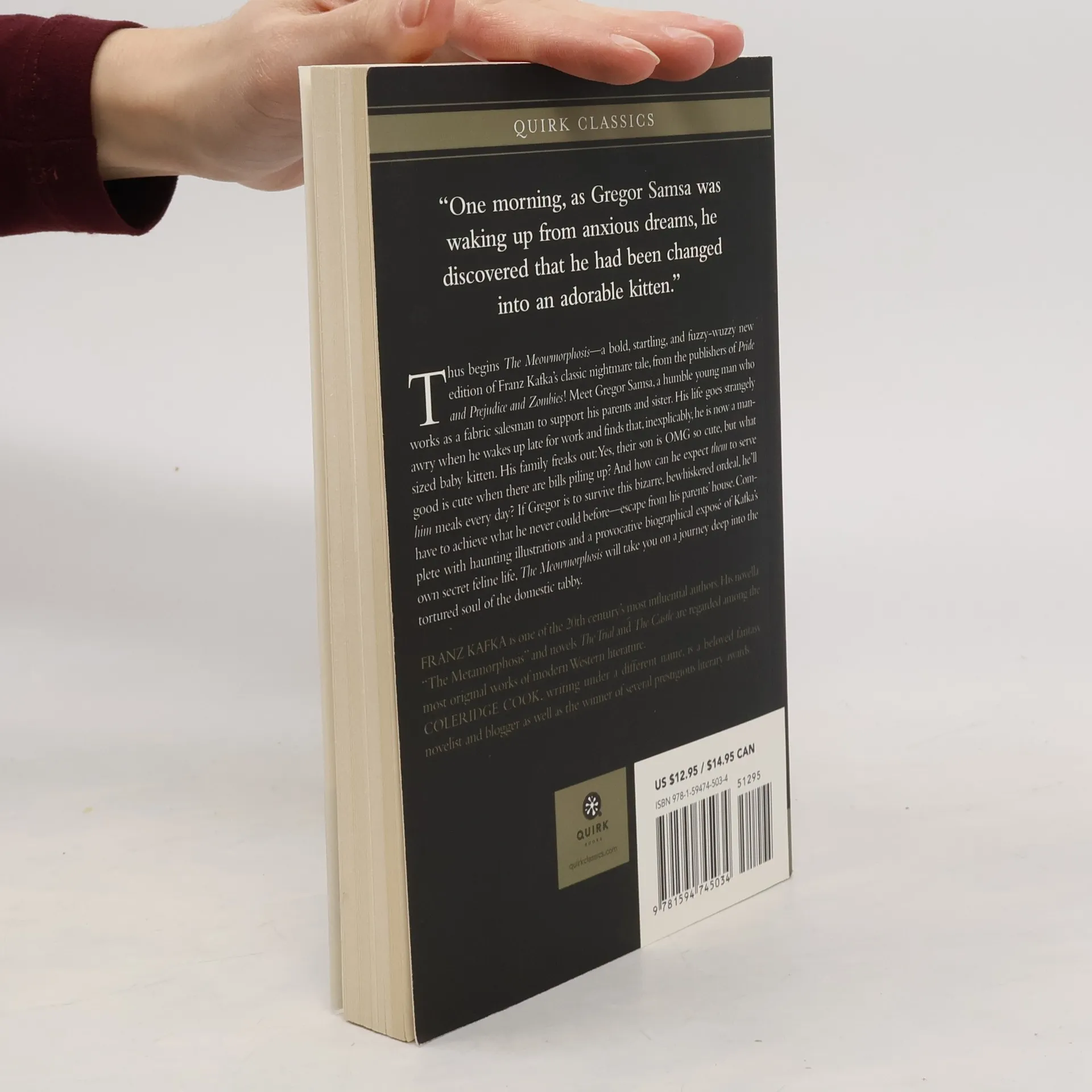 “One morning, as Gregor Samsa was waking up from anxious dreams, he discovered that he had been changed into an adorable kitten.” Thus begins The Meowmorphosis—a bold, startling, and fuzzy-wuzzy new edition of Franz Kafka’s classic nightmare tale, from the publishers of Pride and Prejudice and Zombies! Meet Gregor Samsa, a humble young man who works as a fabric salesman to support his parents and sister. His life goes strangely awry when he wakes up late for work and finds that, inexplicably, he is now a man-sized baby kitten. His family freaks out: Yes, their son is OMG so cute, but what good is cute when there are bills piling up? And how can he expect them to serve him meals every day? If Gregor is to survive this bizarre, bewhiskered ordeal, he’ll have to achieve what he never could before—escape from his parents’ house. Complete with haunting illustrations and a provocative biographical exposé of Kafka’s own secret feline life, The Meowmorphosis will take you on a journey deep into the tortured soul of the domestic tabby.