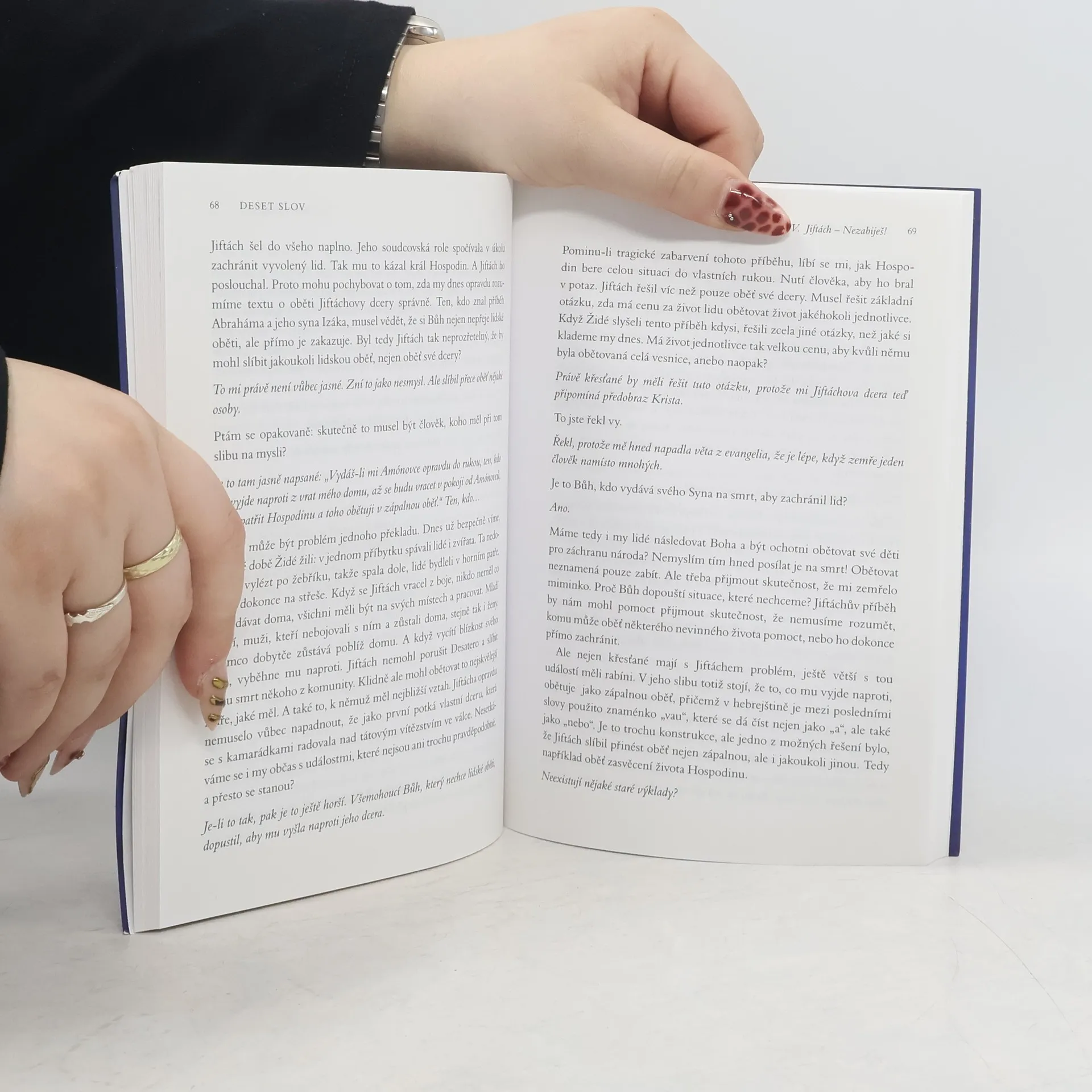 Kniha formou rozhovoru rozvíjí téma deseti Božích přikázání. U každého přikázání se autoři zaměřují na jednu konkrétní starozákonní postavu a její příběh, který se daného přikázání dotýká. Jsou mezi nimi jak ti, kdo navzdory okolnostem přikázání neporušili (Job, matka a synové Makabejští), tak ti, kteří je porušili (Akan, Samson), nebo i oběti překročení přikázání (Uriáš). Rozhovory otevírají nové souvislosti, myšlenky, inspirace. Všechny rozhovory ovlivňuje současná doba, kultura, náboženský styl života. Cílem je nejen nahlédnout na tradiční morální téma jinýma očima, ale také vtáhnout biblickou zkušenost do našeho života, inspirovat se jí, poučit se. Rozhovory jsou vedeny neotřelou formou v atmosféře důvěry a otevřenosti. Otázky jsou provokativní a nečekané, odpovědi kritické i sebekritické. Kniha zaujme nejen věřící, ale téma Desatera se dotýká každého člověka vyrůstajícího z židovsko-křesťanské kultury.