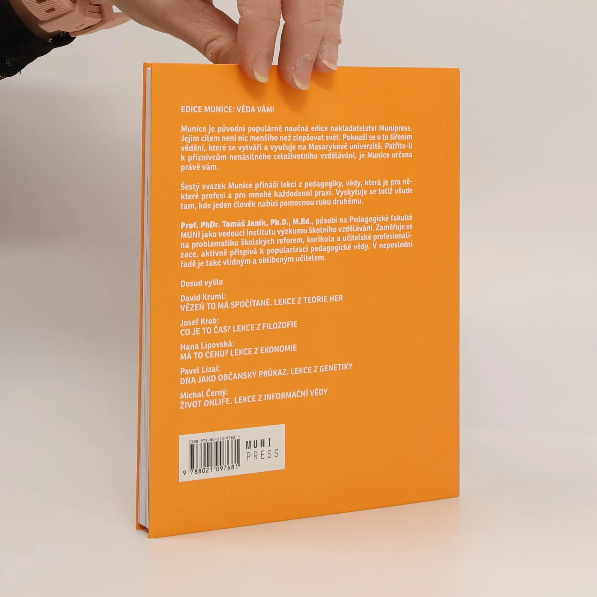 Psát o výchově prý není trendy. Všichni už s tím přestali. Závažnost věci přitom je setrvale vysoká! Proto šestý svazek Munice přináší lekci z pedagogiky, z vědy, která je zároveň profesí, ale i praxí mnoha z nás. Vyskytuje se totiž všude tam, kde jeden nabízí pomocnou ruku druhému. Laskavým průvodcem světem výchovy a vzdělávání bude čtenářům vědec, pedagog a zkušený autor popularizačních knih, prof. Tomáš Janík. Jeho výklad prosvěcuje víra, že v závazku „vše pro výchovu“ spočívá budoucnost lidstva.