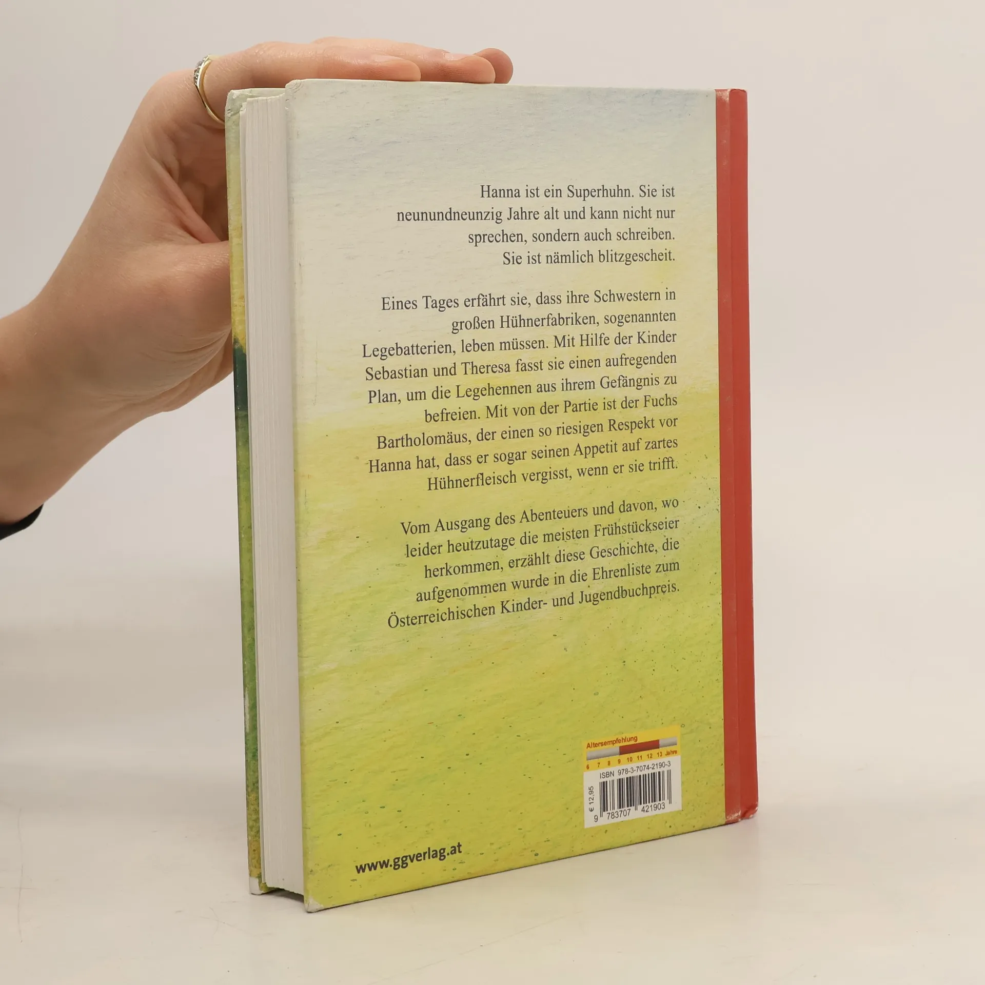 Hanna ist ein Superhuhn. Sie ist neunundneunzig Jahre alt und kann nicht nur sprechen, sondern auch schreiben. Eines Tages erfährt sie, dass ihre Schwestern in großen Hühnerfabriken, sogenannten Legebatterien, leben müssen. Mit Hilfe der Kinder Sebastian und Theresa möchte sie die Hennen aus ihrem Gefängnis befreien ... Man erfährt nicht nur vom Ausgang des spannenden Abenteuers, sondern auch davon, wo leider heutzutage die meisten Frühstückseier herkommen.