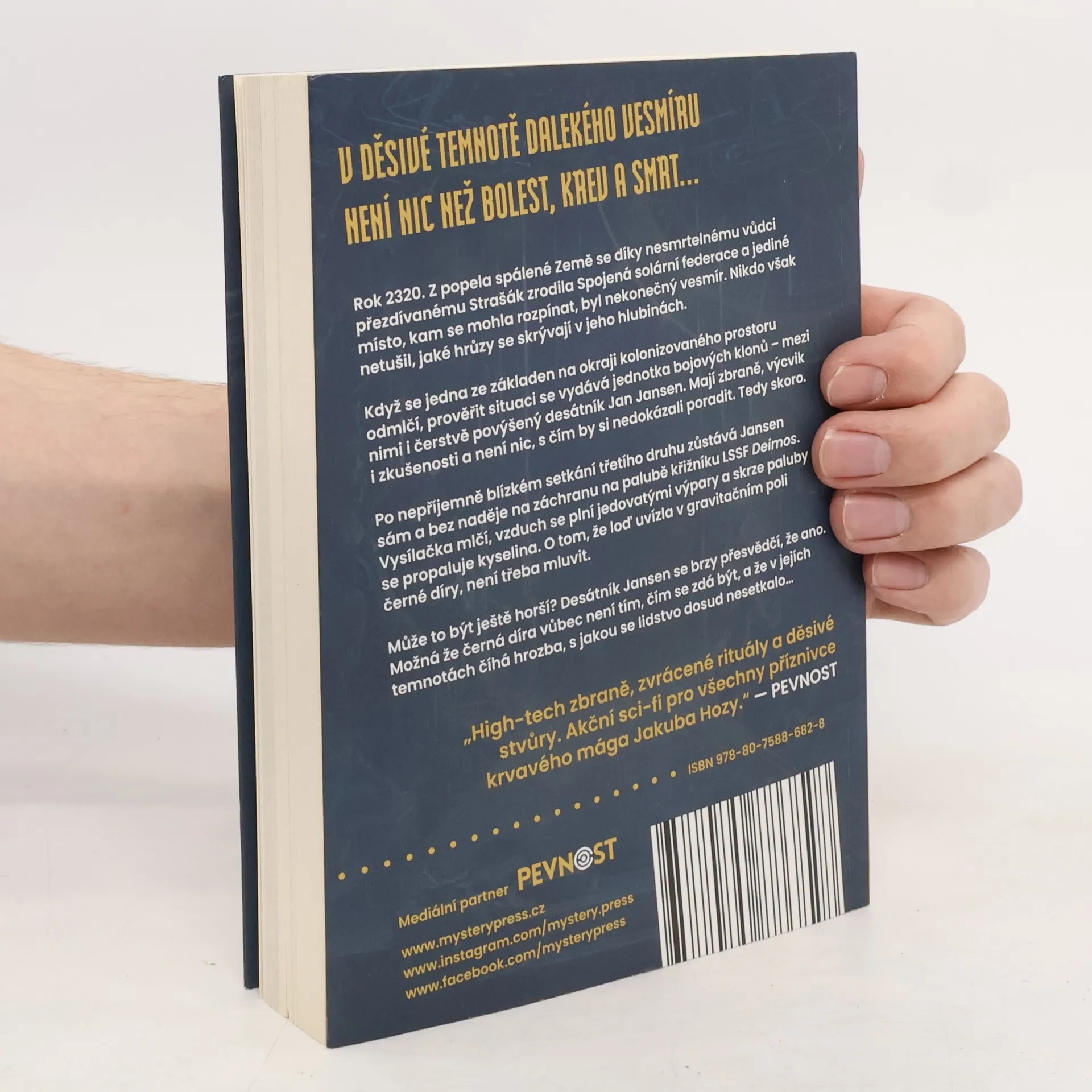 V DĚSIVÉ TEMNOTĚ DALEKÉHO VESMÍRU NENÍ NIC NEŽ BOLEST, KREV A SMRT… Rok 2320. Z popela spálené Země se díky nesmrtelnému vůdci přezdívanému Strašák zrodila Spojená solární federace a jediné místo, kam se mohla rozpínat, byl nekonečný vesmír. Nikdo však netušil, jaké hrůzy se skrývají v jeho hlubinách. Když se jedna ze základen na okraji kolonizovaného prostoru odmlčí, prověřit situaci se vydává jednotka bojových klonů – mezi nimi i čerstvě povýšený desátník Jan Jansen. Mají zbraně, výcvik i zkušenosti a není nic, s čím by si nedokázali poradit. Tedy skoro. Po nepříjemně blízkém setkání třetího druhu zůstává Jansen sám a bez naděje na záchranu na palubě křižníku LSSF Deimos. Vysílačka mlčí, vzduch se plní jedovatými výpary a skrze paluby se propaluje kyselina. O tom, že loď uvízla v gravitačním poli černé díry, není třeba mluvit. Může to být ještě horší? Desátník Jansen se brzy přesvědčí, že ano. Možná že černá díra vůbec není tím, čím se zdá být, a že v jejích temnotách číhá hrozba, s jakou se lidstvo dosud nesetkalo… ___ „High-tech zbraně, zvrácené rituály a děsivé stvůry. Akční sci-fi pro všechny příznivce krvavého mága Jakuba Hozy.“ – PEVNOST