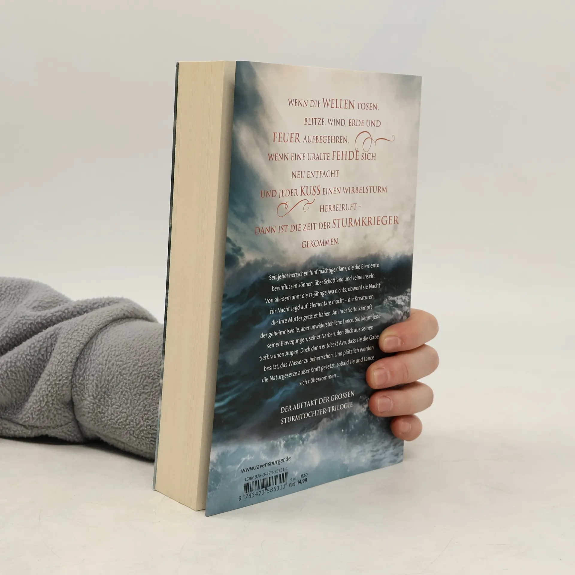 Wenn die Wellen tosen, Blitze, Wind, Erde und Feuer aufbegehren, wenn eine uralte Fehde sich neu entfacht und jeder Kuss einen Wirbelsturm herbeiruft – dann ist die Zeit der Sturmkrieger gekommen. Seit jeher herrschen fünf mächtige Clans, die die Elemente beeinflussen können, über Schottland und seine Inseln. Von alledem ahnt die 17-jährige Ava nichts, obwohl sie Nacht für Nacht Jagd auf Elementare macht – die Kreaturen, die ihre Mutter getötet haben. An ihrer Seite kämpft der geheimnisvolle, aber unwiderstehliche Lance. Sie kennt jede seiner Bewegungen, seiner Narben, den Blick aus seinen tiefbraunen Augen. Doch dann entdeckt Ava, dass sie die Gabe besitzt, das Wasser zu beherrschen. Und plötzlich werden die Naturgesetze außer Kraft gesetzt, sobald sie und Lance sich näherkommen …
