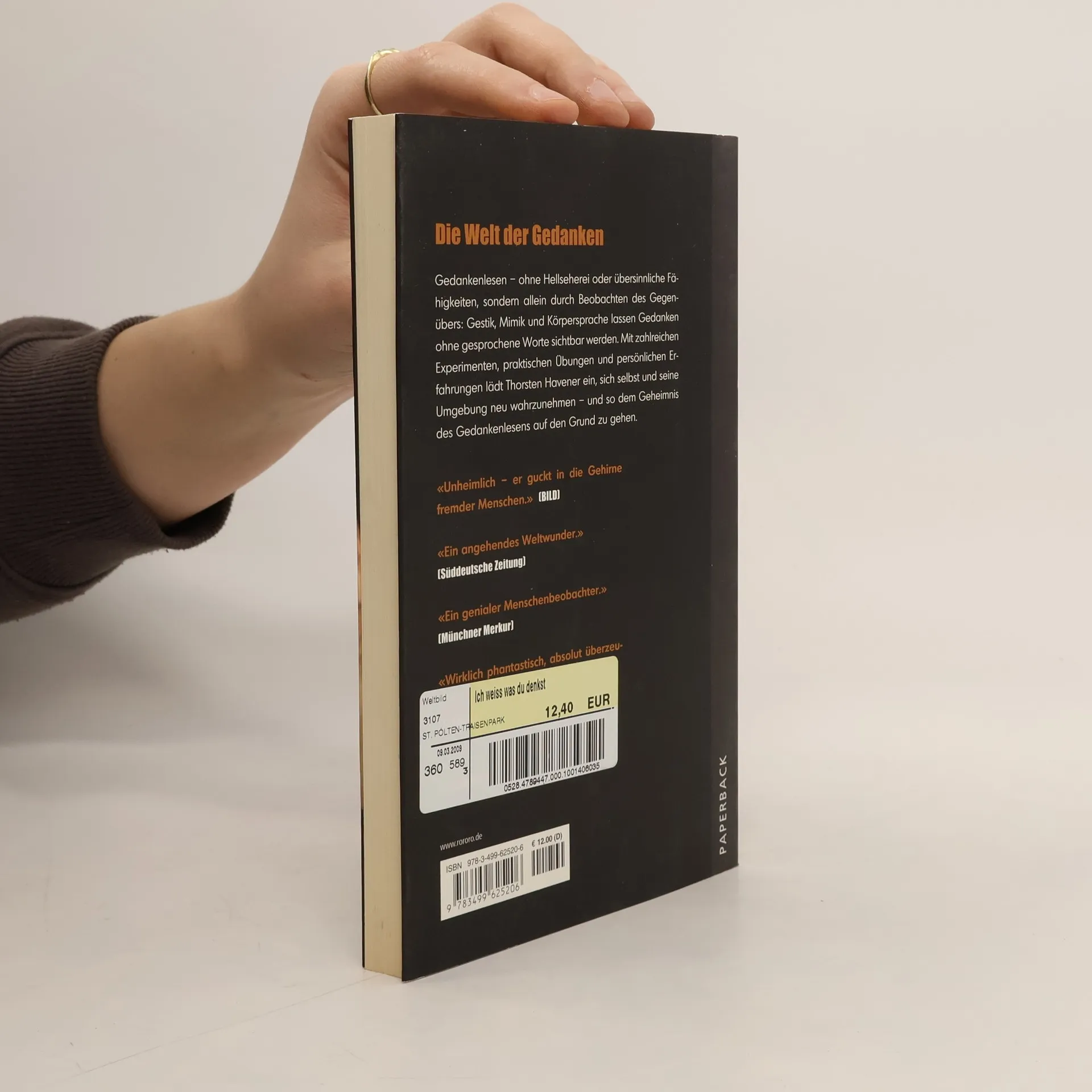 Die Welt der Gedanken Gedankenlesen – ohne Hellseherei oder übersinnliche Fähigkeiten, sondern allein durch Beobachten des Gegenübers: Gestik, Mimik und Körpersprache lassen Gedanken ohne gesprochene Worte sichtbar werden. Mit zahlreichen Experimenten, praktischen Übungen und persönlichen Erfahrungen lädt Thorsten Havener ein, sich selbst und seine Umgebung neu wahrzunehmen – und so dem Geheimnis des Gedankenlesens auf den Grund zu gehen.