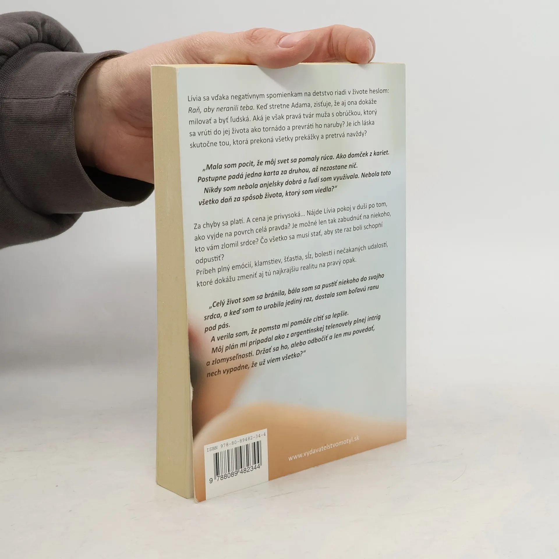 Lívia sa vďaka negatívnym spomienkam na detstvo riadi v živote heslom: Raň, aby neranili teba. Keď stretne Adama, zisťuje, že aj ona dokáže milovať a byť ľudská. Aká je však pravá tvár muža s obrúčkou, ktorý sa vrúti do jej života ako tornádo a prevráti ho naruby? Je ich láska skutočne tou, ktorá prekoná všetky prekážky a pretrvá navždy? „Mala som pocit, že môj svet sa pomaly rúca. Ako domček z kariet. Postupne padá jedna karta za druhou, až nezostane nič. Nikdy som nebola anjelsky dobrá a ľudí som využívala. Nebola toto všetko daň za spôsob života, ktorý som viedla?“ Za chyby sa platí. A cena je privysoká… Nájde Lívia pokoj v duši po tom, ako vyjde na povrch celá pravda? Je možné len tak zabudnúť na niekoho, kto vám zlomil srdce? Čo všetko sa musí stať, aby ste raz boli schopní odpustiť? Príbeh plný emócií, klamstiev, šťastia, sĺz, bolesti i nečakaných udalostí, ktoré dokážu zmeniť aj tú najkrajšiu realitu na pravý opak. „Celý život som sa bránila, bála som sa pustiť niekoho do svojho srdca, a keď som to urobila jediný raz, dostala som boľavú ranu pod pás. A verila som, že pomsta mi pomôže cítiť sa lepšie. Môj plán mi pripadal ako z argentínskej telenovely plnej intríg a zlomyseľnosti. Držať sa ho, alebo odbočiť a len mu povedať, nech vypadne, že už viem všetko?“