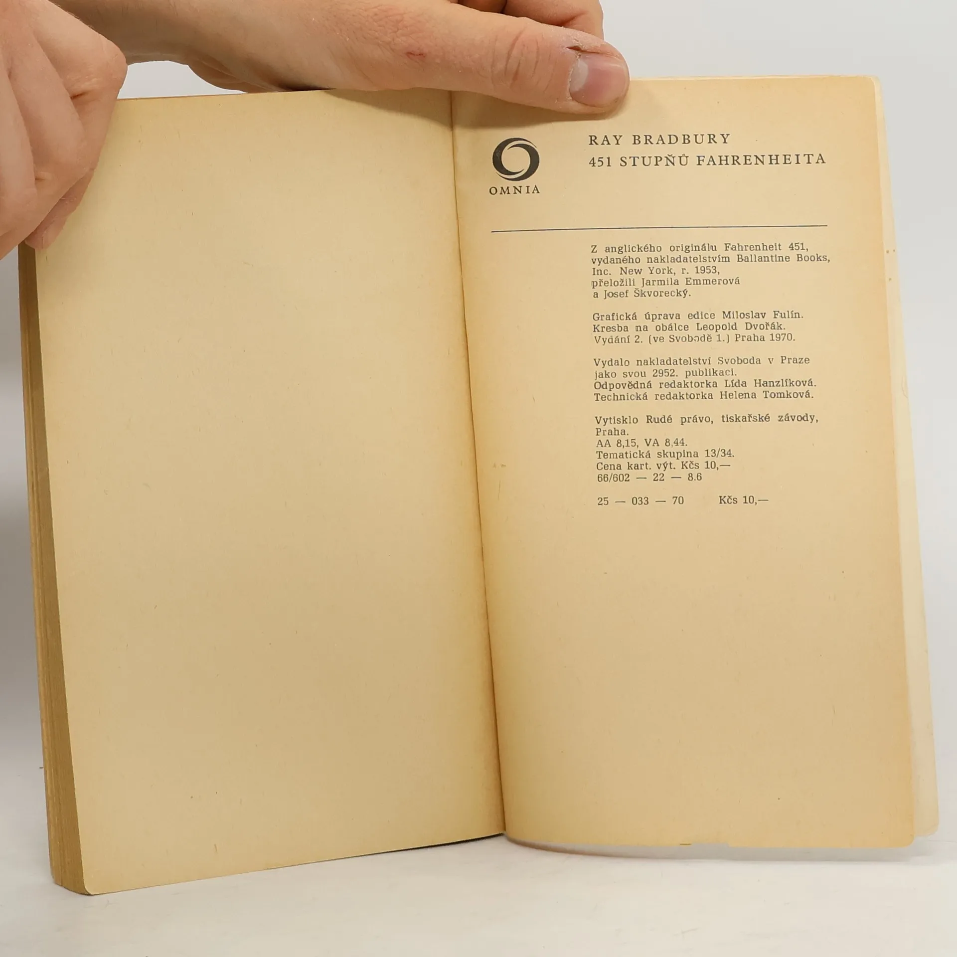 Guy Montag, hrdina románu žije ve své ohnivzdorné vile obklopen civilizací tryskových aut, raketových letadel, mechanické hudby a také ovšem policejních helikoptér a mechanických „ohařů“, kteří svým chemickým čichem neomylně sledují stopu zločince. Kdo je však tímto „zločincem“? Ten, kdo překročí základní zákon této utopistické civilizace, tj. ještě vlastní a čte knihy, kdo nemyslí tak, jak je předepsáno myslet, kdo se pokouší uvažovat samostatně. Tohoto „zločinu“ se právě dopustí Montag. A o příšerné, hrůzné štvanici, kterou na něho uspořádá policie ve svých helikoptérách, o zmechanizovaném děsu, který je mu v patách v podobě mechanického ohaře s prokainovou jehlou v čelisti, o úděsné televizní reportáži z této honičky a o konečném zániku onoho odlidštěného světa vypráví tento příběh. Je to jedno z nejlepších Bradburyho děl, v němž nastavil křivé zrcadlo fantastiky civilizaci moderního světa, jež člověku nepřinese skutečné štěstí, dusí-li v něm to nejcennější – lidskou myšlenku. Vydavatelství Svoboda v edici Omnia, kniha vydána s názvem 451° Fahrenheita (viz obálka knihy) Vydání druhé Překlad - Jarmila Emmerová, Josef Škvorecký Autor obálky - Leopold Dvořák Vazba brožovaná Počet stran 155 Doslov napsal Josef Škvorecký