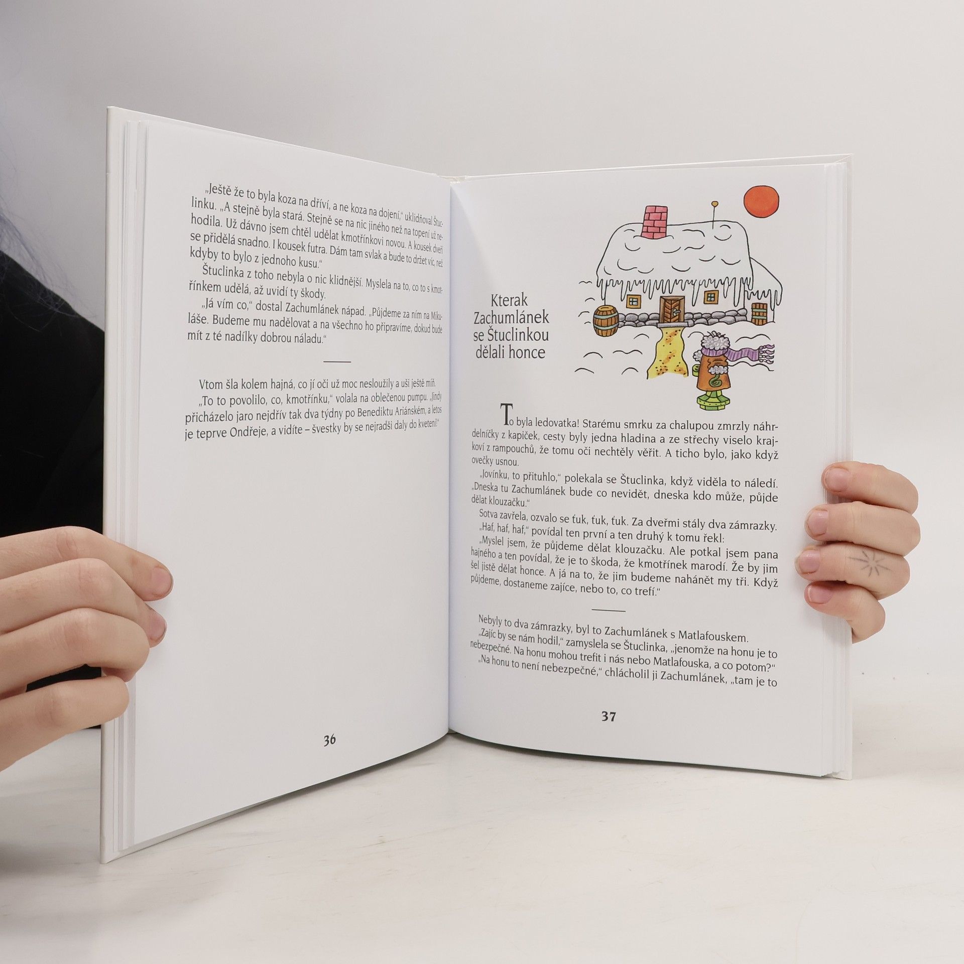 Zimní příběh o dvou šikovných dětech, které si dokáží samy poradit, když kmotřínek, který se o ně stará, nečekaně onemocní, protože mu došel česnek, a musí do nemocnice. Štuclinka se Zachumlánkem občas s obtížemi, ale vždy vtipně a se spoustou fantazie vyřeší, jak zateplit pumpu, jak zachránit dusící se kapry, jak porazit soušku, jak sestrojit dřevošmik, jak rozveselit kmotřínka mikulášskou nadílkou i jak napéct cukroví. Když je toho na ně moc, pomáhá jim pejsek Matlafousek, hajný s hajnou, která nosí v hlavě snad všechny svaté z kalendáře, i hodný pan doktor se sestřičkou. Nenapodobitelné vypravěčské umění Františka Nepila v tomto půvabném, laskavém, nápaditém a hlavně ryze českém příběhu potěší nejen děti, ale i jejich rodiče a prarodiče.